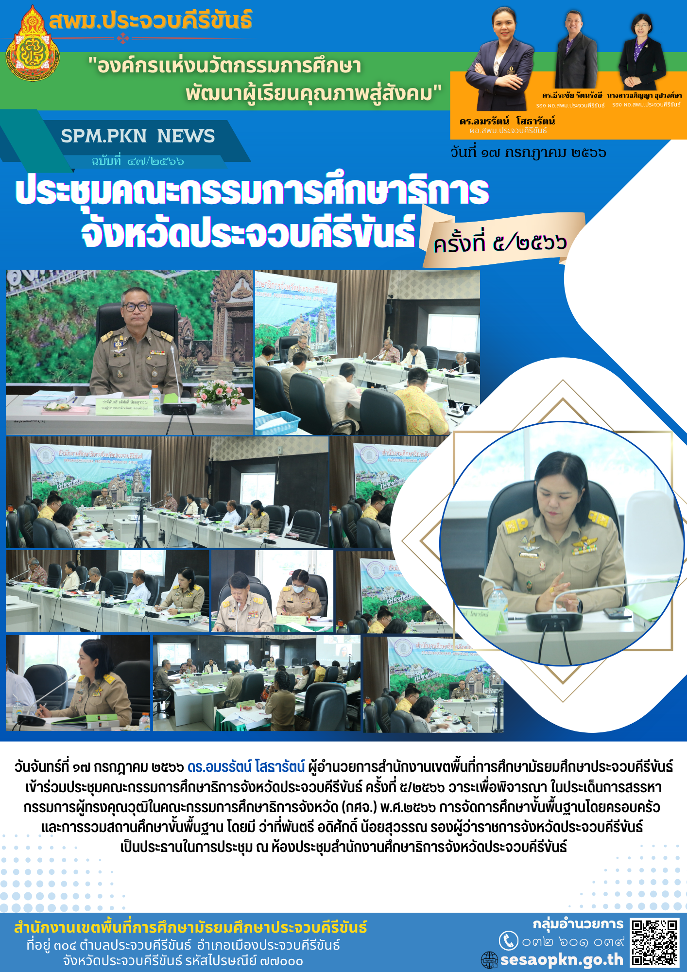 วันจันทร์ที่ ๑๗ กรกฎาคม ๒๕๖๖ ดร.อมรรัตน์ โสธารัตน์ ผู้อำนวยการสำนักงานเขตพื้นที่การศึกษามัธยมศึกษาประจวบคีรีขันธ์ เข้าร่วมประชุมคณะกรรมการศึกษาธิการจังหวัดประจวบคีรีขันธ์ ครั้งที่ ๕/๒๕๖๖ วาระเพื่อพิจารณาในประเด็นการสรรหากรรมการผู้ทรงคุณวุฒิในคณะกรรมการศึกษาธิการจังหวัด (กศจ.) พ.ศ.๒๕๖๖ การจัดการศึกษาขั้นพื้นฐานโดยครอบครัว และการรวมสถานศึกษาขั้นพื้นฐาน โดยมี ว่าที่พันตรี อดิศักดิ์ น้อยสุวรรณ รองผู้ว่าราชการจังหวัดประจวบคีรีขันธ์ เป็นประธานในการประชุม ณ ห้องประชุมสำนักงานศึกษาธิการจังหวัดประจวบคีรีขันธ์