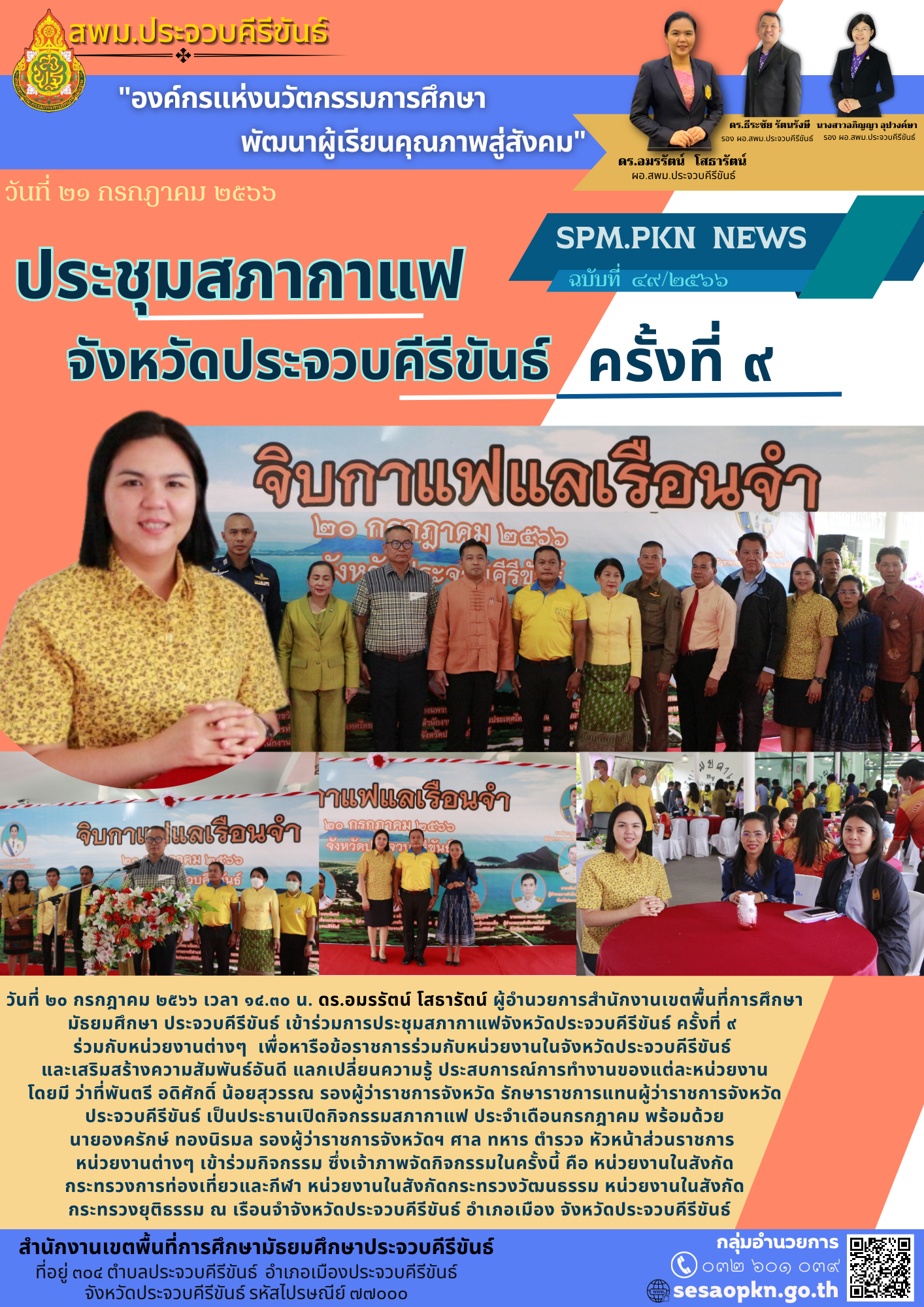 วันที่ ๒๐ กรกฎาคม ๒๕๖๖ เวลา ๑๔.๓๐ น. ดร.อมรรัตน์ โสธารัตน์ ผู้อำนวยการสำนักงานเขตพื้นที่การศึกษามัธยมศึกษา ประจวบคีรีขันธ์ เข้าร่วมการประชุมสภากาแฟจังหวัดประจวบคีรีขันธ์ ครั้งที่ ๙ ร่วมกับหน่วยงานต่างๆ  เพื่อหารือข้อราชการร่วมกับหน่วยงานในจังหวัดประจวบคีรีขันธ์ และเสริมสร้างความสัมพันธ์อันดี แลกเปลี่ยนความรู้ ประสบการณ์การทำงานของแต่ละหน่วยงาน โดยมี ว่าที่พันตรี อดิศักดิ์ น้อยสุวรรณ รองผู้ว่าราชการจังหวัด รักษาราชการแทนผู้ว่าราชการจังหวัดประจวบคีรีขันธ์ เป็นประธานเปิดกิจกรรมสภากาแฟ ประจำเดือนกรกฎาคม พร้อมด้วย นายองครักษ์ ทองนิรมล รองผู้ว่าราชการจังหวัดฯ ศาล ทหาร ตำรวจ หัวหน้าส่วนราชการ หน่วยงานต่างๆ เข้าร่วมกิจกรรม ซึ่งเจ้าภาพจัดกิจกรรมในครั้งนี้ คือ หน่วยงานในสังกัดกระทรวงการท่องเที่ยวและกีฬา หน่วยงานในสังกัดกระทรวงวัฒนธรรม หน่วยงานในสังกัดกระทรวงยุติธรรม ณ เรือนจำจังหวัดประจวบคีรีขันธ์ อำเภอเมือง จังหวัดประจวบคีรีขันธ์