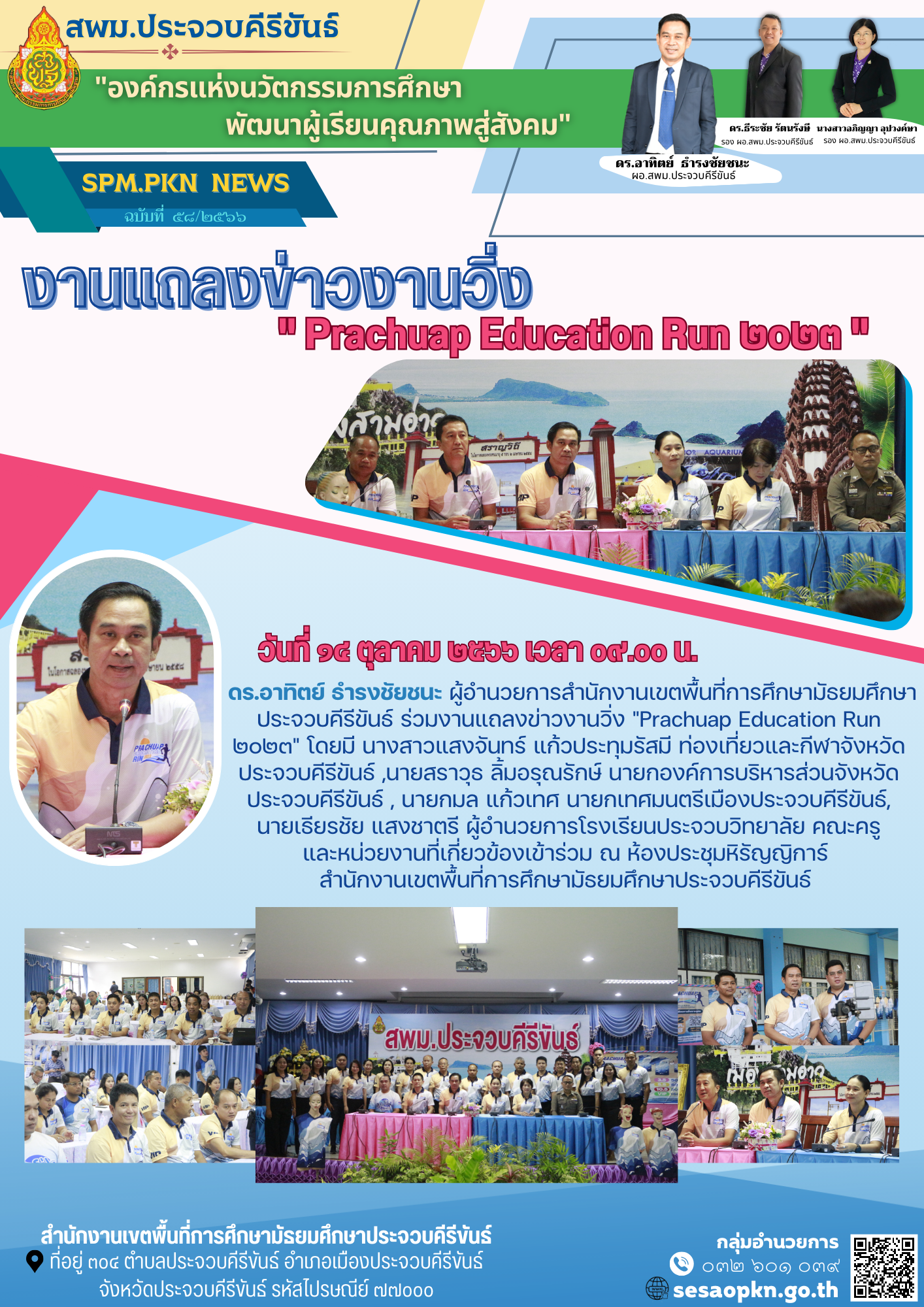 วันที่ ๑๔ ตุลาคม ๒๕๖๖ เวลา ๐๙.๐๐ น. ดร.อาทิตย์ ธำรงชัยชนะ ผู้อำนวยการสำนักงานเขตพื้นที่การศึกษามัธยมศึกษาประจวบคีรีขันธ์ ร่วมงานแถลงข่าวงานวิ่ง "Prachuap Education Run ๒๐๒๓" โดยมี นางสาวแสงจันทร์ แก้วประทุมรัสมี ท่องเที่ยวและกีฬาจังหวัดประจวบคีรีขันธ์ ,นายสราวุธ ลิ้มอรุณรักษ์ นายกองค์การบริหารส่วนจังหวัดประจวบคีรีขันธ์ , นายกมล แก้วเทศ นายกเทศมนตรีเมืองประจวบคีรีขันธ์, นายเธียรชัย แสงชาตรี ผู้อำนวยการโรงเรียนประจวบวิทยาลัย คณะครู และหน่วยงานที่เกี่ยวข้องเข้าร่วม ณ ห้องประชุมหิรัญญิการ์ สำนักงานเขตพื้นที่การศึกษามัธยมศึกษาประจวบคีรีขันธ์