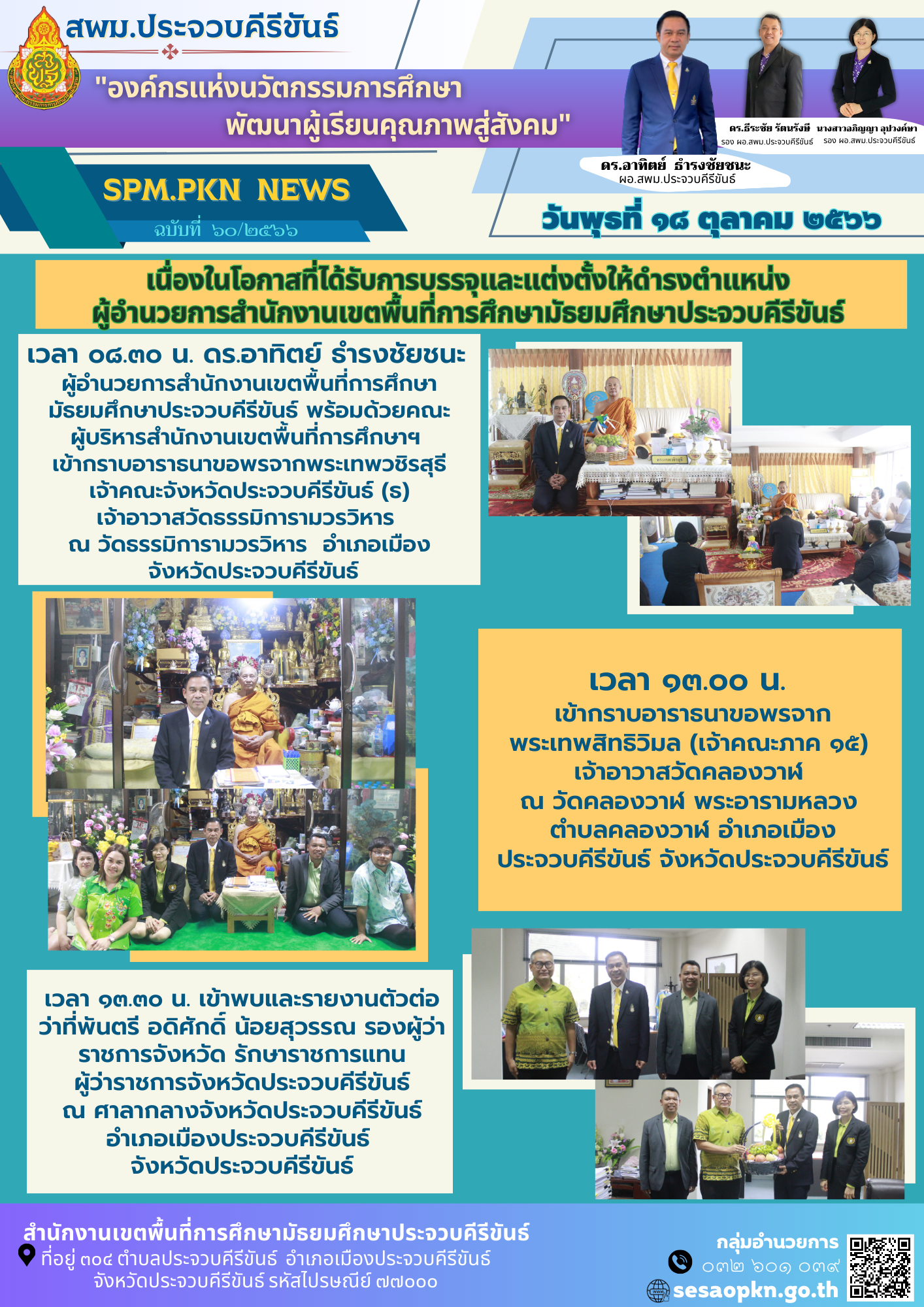 วันพุธที่ ๑๘ ตุลาคม ๒๕๖๖ เวลา ๐๘.๓๐ น. ดร.อาทิตย์ ธำรงชัยชนะ ผู้อำนวยการสำนักงานเขตพื้นที่การศึกษามัธยมศึกษาประจวบคีรีขันธ์ พร้อมด้วยคณะผู้บริหารสำนักงานเขตพื้นที่การศึกษาฯ  เข้ากราบอาราธนาขอพรจากพระเทพวชิรสุธี เจ้าคณะจังหวัดประจวบคีรีขันธ์ (ธ) เจ้าอาวาสวัดธรรมิการามวรวิหาร ณ วัดธรรมิการามวรวิหาร ตำบลประจวบ อำเภอเมืองประจวบคีรีขันธ์ จังหวัดประจวบคีรีขันธ์