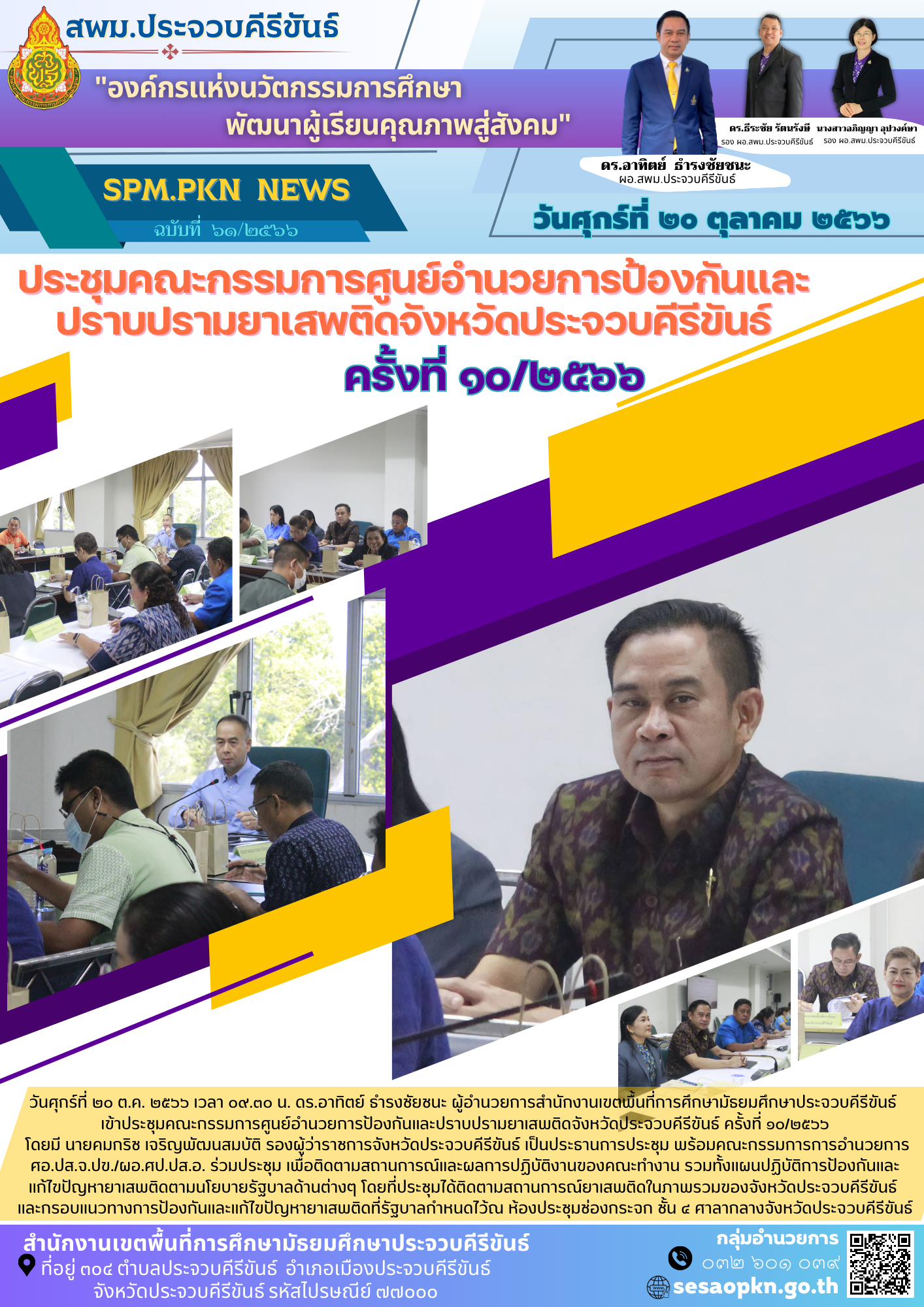 วันศุกร์ที่ ๒๐ ต.ค. ๒๕๖๖ เวลา ๐๙.๓๐ น. ดร.อาทิตย์ ธำรงชัยชนะ ผู้อำนวยการสำนักงานเขตพื้นที่การศึกษามัธยมศึกษาประจวบคีรีขันธ์ เข้าประชุมคณะกรรมการศูนย์อำนวยการป้องกันและปราบปรามยาเสพติดจังหวัดประจวบคีรีขันธ์ ครั้งที่ ๑๐/๒๕๖๖ โดยมี นายคมกริช เจริญพัฒนสมบัติ รองผู้ว่าราชการจังหวัดประจวบคีรีขันธ์ เป็นประธานการประชุม พร้อมคณะกรรมการการอำนวยการ ศอ.ปส.จ.ปข./ผอ.ศป.ปส.อ. ร่วมประชุม เพื่อติดตามสถานการณ์และผลการปฏิบัติงานของคณะทำงาน รวมทั้งแผนปฏิบัติการป้องกันและแก้ไขปัญหายาเสพติดตามนโยบายรัฐบาลด้านต่างๆ โดยที่ประชุมได้ติดตามสถานการณ์ยาเสพติดในภาพรวมของจังหวัดประจวบคีรีขันธ์ และกรอบแนวทางการป้องกันและแก้ไขปัญหายาเสพติดที่รัฐบาลกำหนดไว้ณ ห้องประชุมช่องกระจก ชั้น ๔ ศาลากลางจังหวัดประจวบคีรีขันธ์
