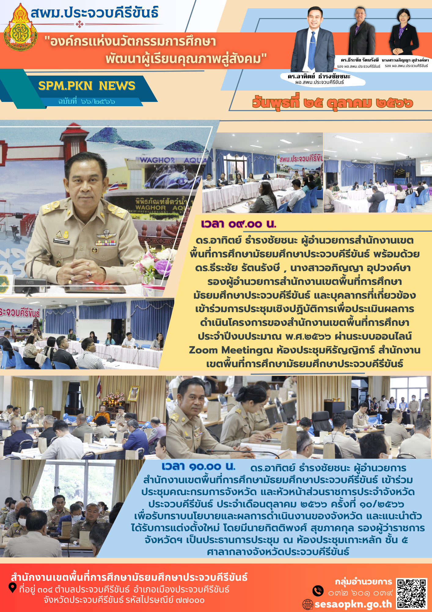 วันพุธที่ ๒๕ ตุลาคม ๒๕๖๖ เวลา ๐๙.๐๐ น. ดร.อาทิตย์ ธำรงชัยชนะ ผู้อำนวยการสำนักงานเขตพื้นที่การศึกษามัธยมศึกษาประจวบคีรีขันธ์ พร้อมด้วย ดร.ธีระชัย รัตนรังษี , นางสาวอภิญญา อุปวงค์ษา รองผู้อำนวยการสำนักงานเขตพื้นที่การศึกษามัธยมศึกษาประจวบคีรีขันธ์ และบุคลากรที่เกี่ยวข้อง เข้าร่วมการประชุมเชิงปฏิบัติการเพื่อประเมินผลการดำเนินโครงการของสำนักงานเขตพื้นที่การศึกษา ประจำปีงบประมาณ พ.ศ.๒๕๖๖ ผ่านระบบออนไลน์ Zoom Meeting ณ ห้องประชุมหิรัญญิการ์ สำนักงานเขตพื้นที่การศึกษามัธยมศึกษาประจวบคีรีขันธ์