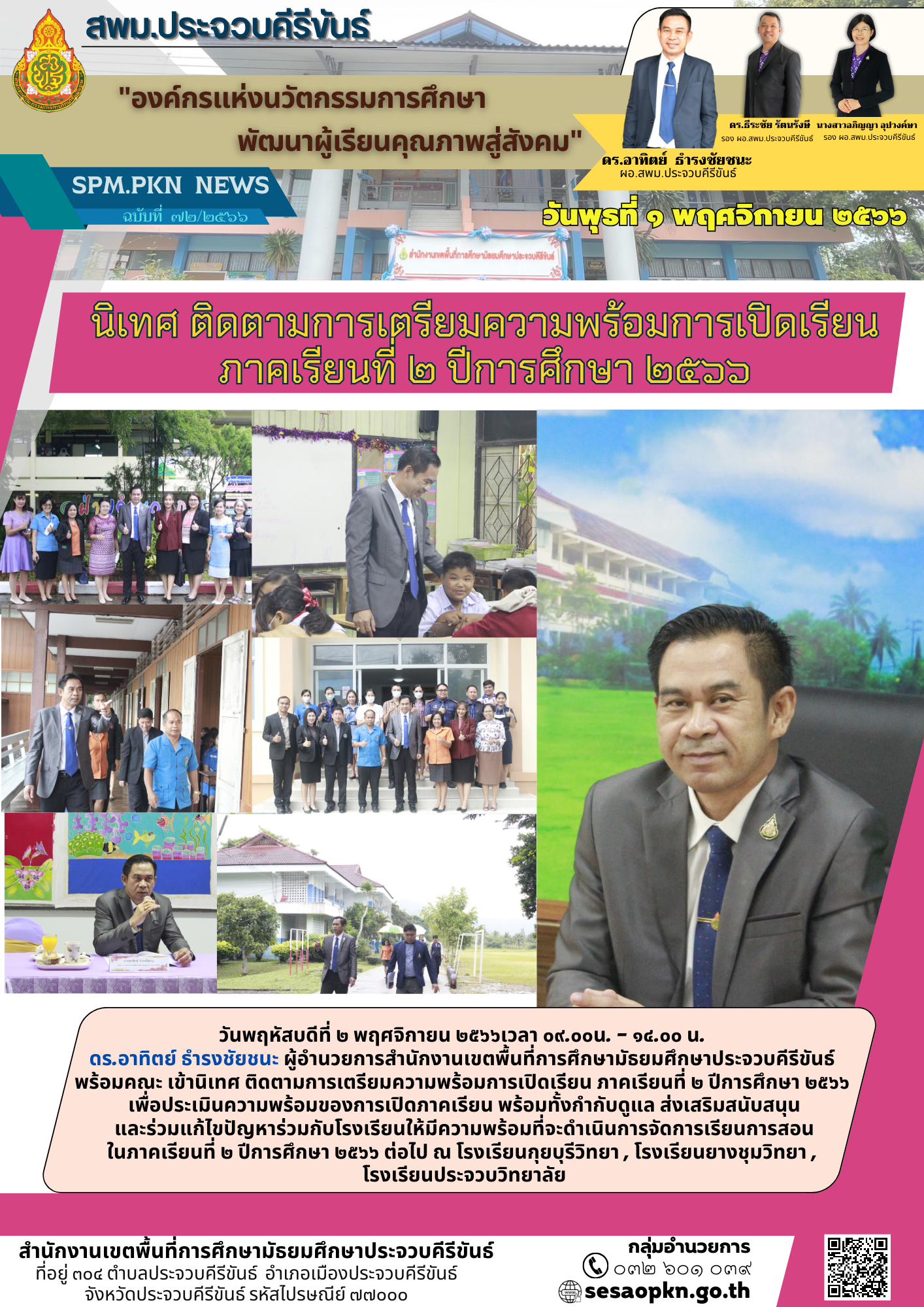 วันพฤหัสบดีที่ ๒ พฤศจิกายน ๒๕๖๖ เวลา ๐๙.๐๐น. - ๑๔.๐๐ น. ดร.อาทิตย์ ธำรงชัยชนะ ผู้อำนวยการสำนักงานเขตพื้นที่การศึกษามัธยมศึกษาประจวบคีรีขันธ์ พร้อมคณะ เข้านิเทศ ติดตามการเตรียมความพร้อมการเปิดเรียน ภาคเรียนที่ ๒ ปีการศึกษา ๒๕๖๖ เพื่อประเมินความพร้อมของการเปิดภาคเรียน พร้อมทั้งกำกับดูแล ส่งเสริมสนับสนุนและร่วมแก้ไขปัญหาร่วมกับโรงเรียนให้มีความพร้อมที่จะดำเนินการจัดการเรียนการสอนในภาคเรียนที่ ๒ ปีการศึกษา ๒๕๖๖ ต่อไป ณ โรงเรียนกุยบุรีวิทยา , โรงเรียนยางชุมวิทยา , โรงเรียนประจวบวิทยาลัย