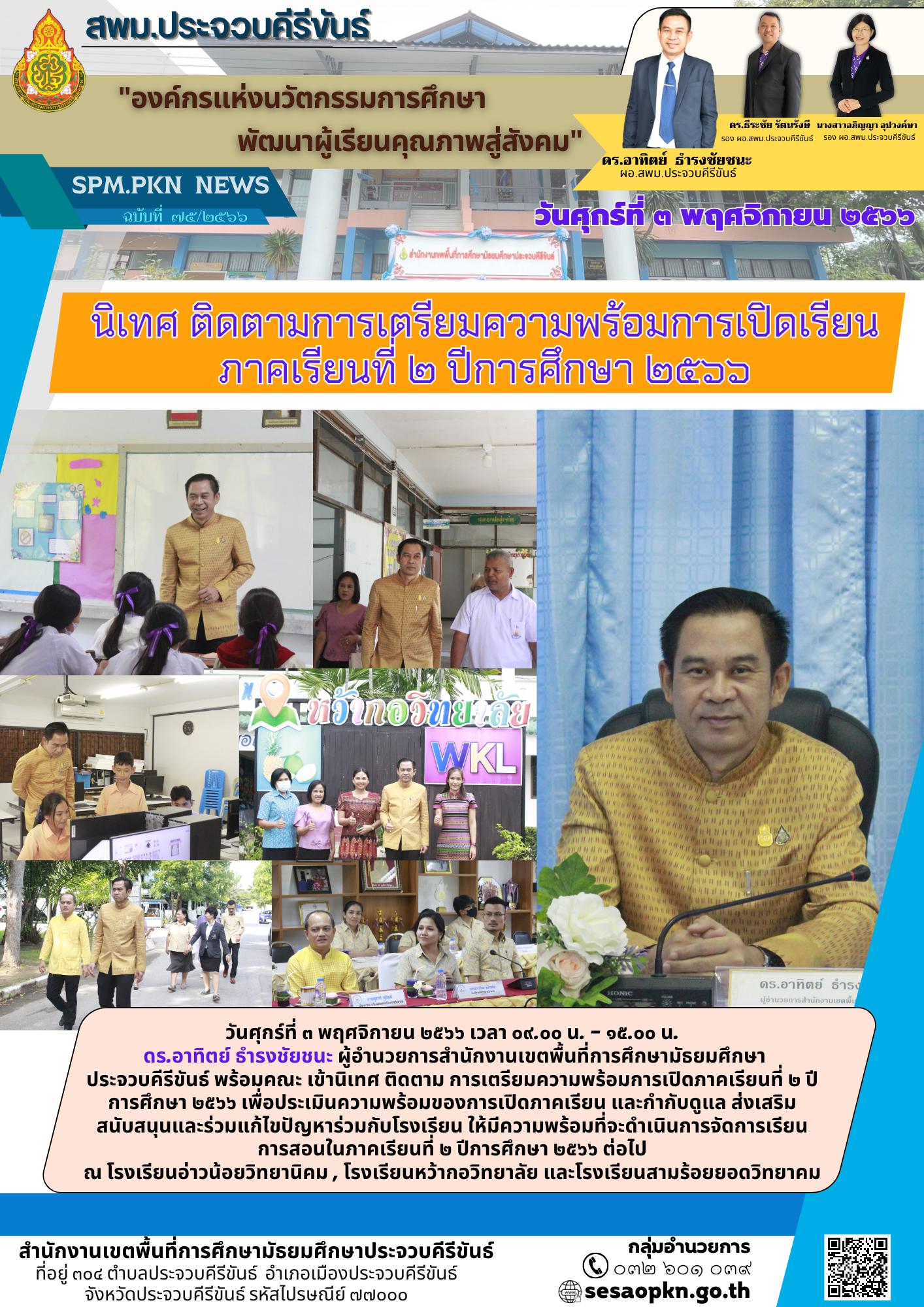 วันศุกร์ที่ ๓ พฤศจิกายน ๒๕๖๖ เวลา ๐๙.๐๐ น. - ๑๕.๐๐ น. ดร.อาทิตย์  ธำรงชัยชนะ ผู้อำนวยการสำนักงานเขตพื้นที่การศึกษามัธยมศึกษาประจวบคีรีขันธ์ พร้อมคณะ เข้านิเทศ ติดตาม การเตรียมความพร้อมการเปิดภาคเรียนที่ ๒ ปีการศึกษา ๒๕๖๖ เพื่อประเมินความพร้อมของการเปิดภาคเรียน และกำกับดูแล ส่งเสริมสนับสนุนและร่วมแก้ไขปัญหาร่วมกับโรงเรียน ให้มีความพร้อมที่จะดำเนินการจัดการเรียนการสอนในภาคเรียนที่ ๒ ปีการศึกษา ๒๕๖๖ ต่อไป ณ โรงเรียนอ่าวน้อยวิทยานิคม , โรงเรียนหว้ากอวิทยาลัย และโรงเรียนสามร้อยยอดวิทยาคม