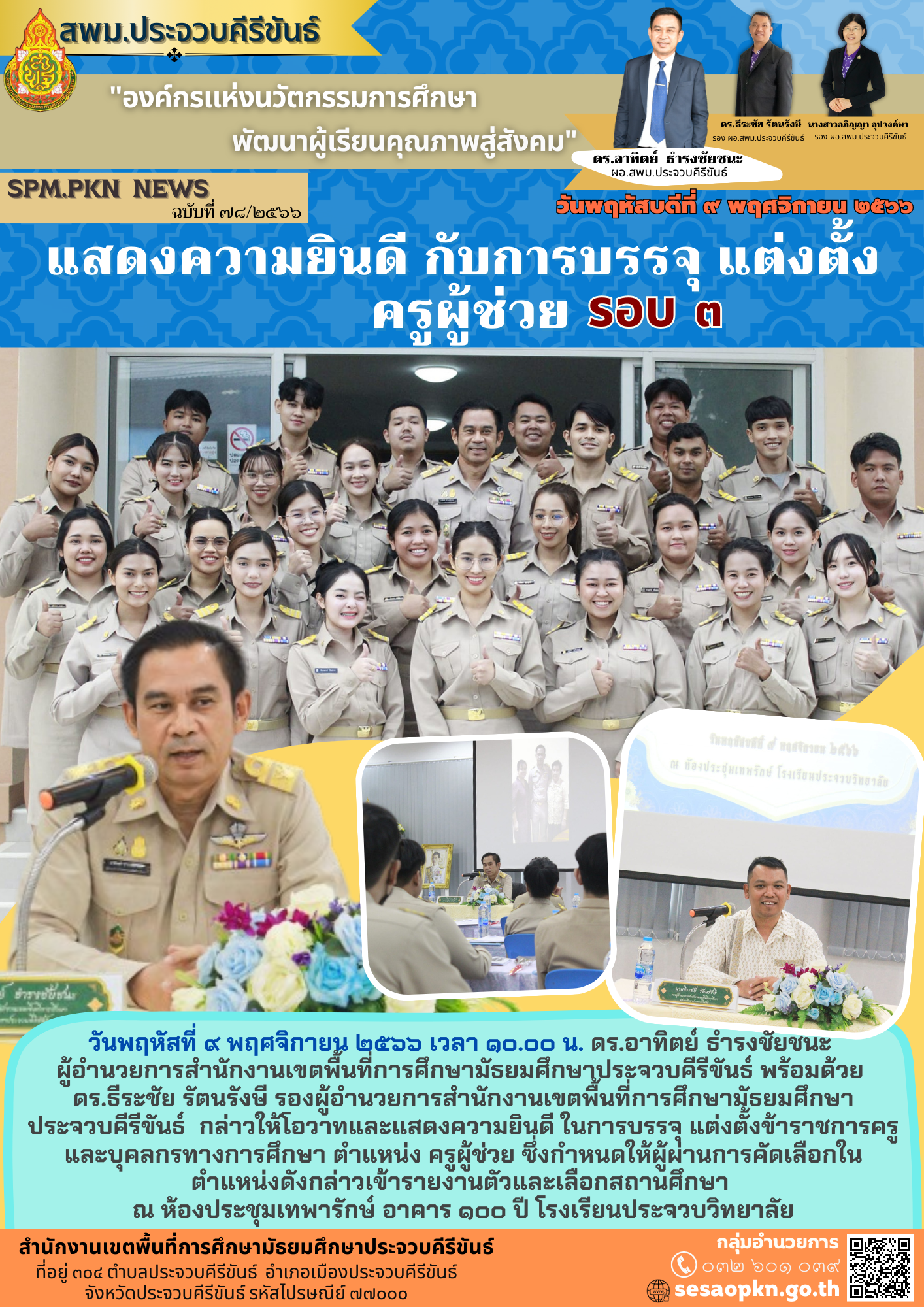 วันที่ ๙ พฤศจิกายน ๒๕๖๖ เวลา ๑๐.๐๐ น. ดร.อาทิตย์ ธำรงชัยชนะ ผู้อำนวยการสำนักงานเขตพื้นที่การศึกษามัธยมศึกษาประจวบคีรีขันธ์ พร้อมด้วย ดร.ธีระชัย รัตนรังษี รองผู้อำนวยการสำนักงานเขตพื้นที่การศึกษามัธยมศึกษาประจวบคีรีขันธ์ กล่าวให้โอวาทและแสดงความยินดี ในการบรรจุ แต่งตั้งข้าราชการครูและบุคลกรทางการศึกษา ตำแหน่ง ครูผู้ช่วย ซึ่งกำหนดให้ผู้ผ่านการคัดเลือกในตำแหน่งดังกล่าวเข้ารายงานตัวและเลือกสถานศึกษา  ณ ห้องประชุมเทพารักษ์ อาคาร ๑๐๐ ปี โรงเรียนประจวบวิทยาลัย