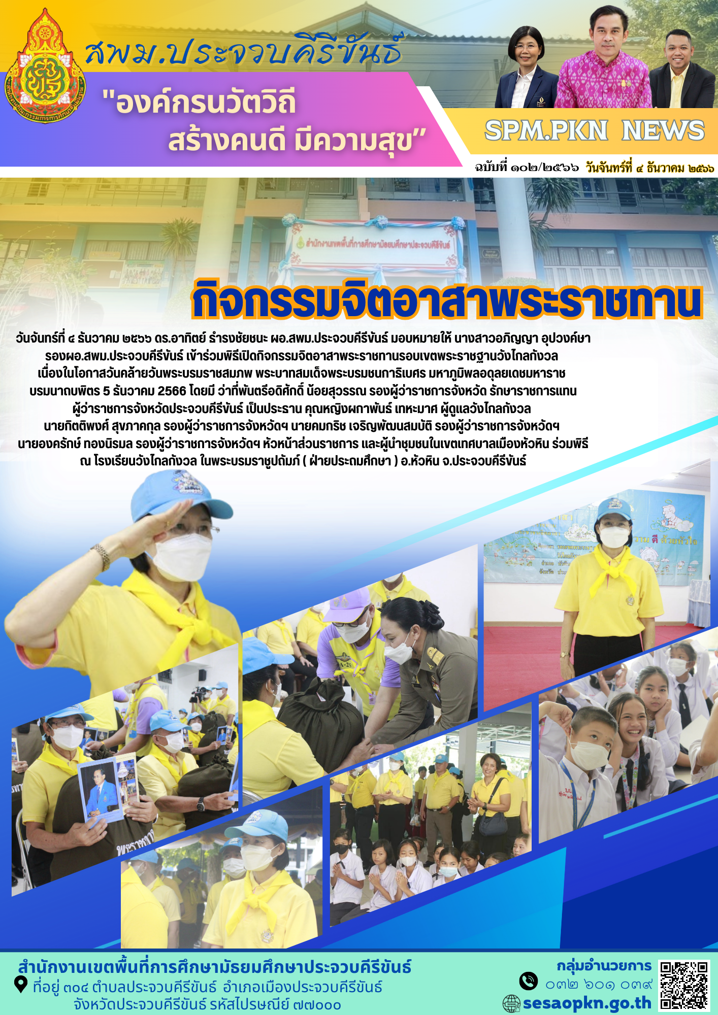 วันจันทร์ที่ 4 ธันวาคม 2566 ดร.อาทิตย์ ธำรงชัยชนะ ผอ.สพม.ประจวบคีรีขันธ์ มอบหมายให้ นางสาวอภิญญา อุปวงค์ษา รองผอ.สพม.ประจวบคีรีขันธ์ เข้าร่วมพิธีเปิดกิจกรรมจิตอาสาพระราชทานรอบเขตพระราชฐานวังไกลกังวล เนื่องในโอกาสวันคล้ายวันพระบรมราชสมภพ พระบาทสมเด็จพระบรมชนกาธิเบศร มหาภูมิพลอดุลยเดชมหาราช บรมนาถบพิตร 5 ธันวาคม 2566 โดยมี ว่าที่พันตรีอดิศักดิ์ น้อยสุวรรณ รองผู้ว่าราชการจังหวัด รักษาราชการแทนผู้ว่าราชการจังหวัดประจวบคีรีขันธ์ เป็นประธาน  คุณหญิงผกาพันธ์ เทหะมาศ ผู้ดูแลวังไกลกังวล นายกิตติพงศ์ สุขภาคกุล รองผู้ว่าราชการจังหวัดฯ นายคมกริช เจริญพัฒนสมบัติ รองผู้ว่าราชการจังหวัดฯ นายองครักษ์ ทองนิรมล รองผู้ว่าราชการจังหวัดฯ หัวหน้าส่วนราชการ และผู้นำชุมชนในเขตเทศบาลเมืองหัวหิน ร่วมพิธี ณ โรงเรียนวังไกลกังวล ในพระบรมราชูปถัมภ์ ( ฝ่ายประถมศึกษา ) อ.หัวหิน จ.ประจวบคีรีขันธ์