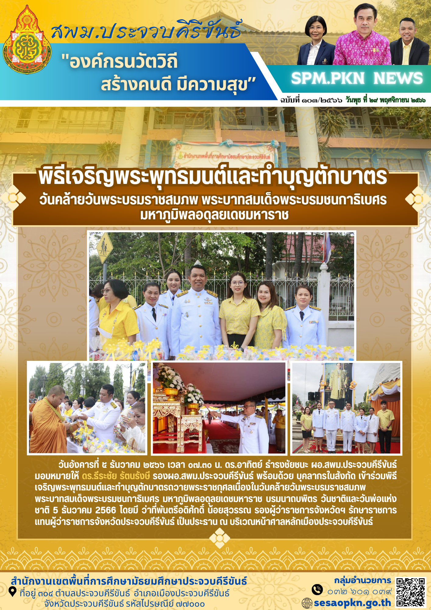 วันอังคารที่ 5 ธันวาคม 2566 เวลา 07.30 น. ดร.อาทิตย์ ธำรงชัยชนะ ผอ.สพม.ประจวบคีรีขันธ์ มอบหมายให้ ดร.ธีระชัย รัตนรังษี รองผอ.สพม.ประจวบคีรีขันธ์ พร้อมด้วย บุคลากรในสังกัด เข้าร่วมพิธีเจริญพระพุทธมนต์และทำบุญตักบาตรถวายพระราชกุศลเนื่องในวันคล้ายวันพระบรมราชสมภพ พระบาทสมเด็จพระบรมชนกาธิเบศร มหาภูมิพลอดุลยเดชมหาราช บรมนาถบพิตร วันชาติและวันพ่อแห่งชาติ 5 ธันวาคม 2566 โดยมี ว่าที่พันตรีอดิศักดิ์ น้อยสุวรรณ รองผู้ว่าราชการจังหวัดฯ รักษาราชการแทนผู้ว่าราชการจังหวัดประจวบคีรีขันธ์ เป็นประธาน ณ บริเวณหน้าศาลหลักเมืองประจวบคีรีขันธ์