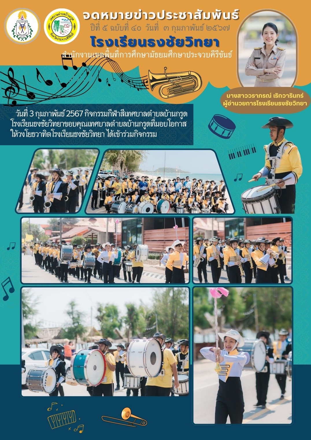 วันที่ 3 กุมภาพันธ์ 2567 กิจกรรมกีฬาสีเทศบาลตำบลบ้านกรูด โรงเรียนธงชัยวิทยาขอบคุณเทศบาลตำบลบ้านกรูดที่มอบโอกาส ให้วงโยธวาทิตโรงเรียนธงชัยวิทยา ได้เข้าร่วมกิจกรรม