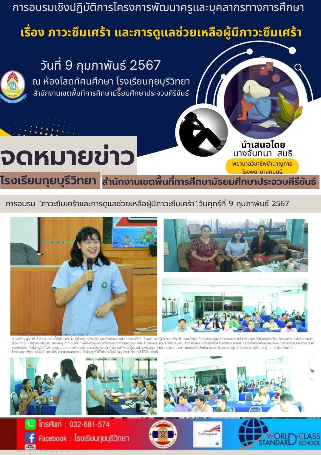 โรงเรียนกุยบุรีวิทยา สำนักงานเขตพื้นที่การศึกษามัธยมศึกษาประจวบคีรีขันธ์ การอบรม "ภาวะซึมเศร้าและการดูแลช่วยเหลือผู้มีภาวะซึมเศร้า" วันศุกร์ที่ 9 กุมภาพันธ์ 2567 นำเสนอโดย นางจันทนา สนธิ พยาบาลวิชาชีพชำนาญการ โรงพยาบาลกุยบรี