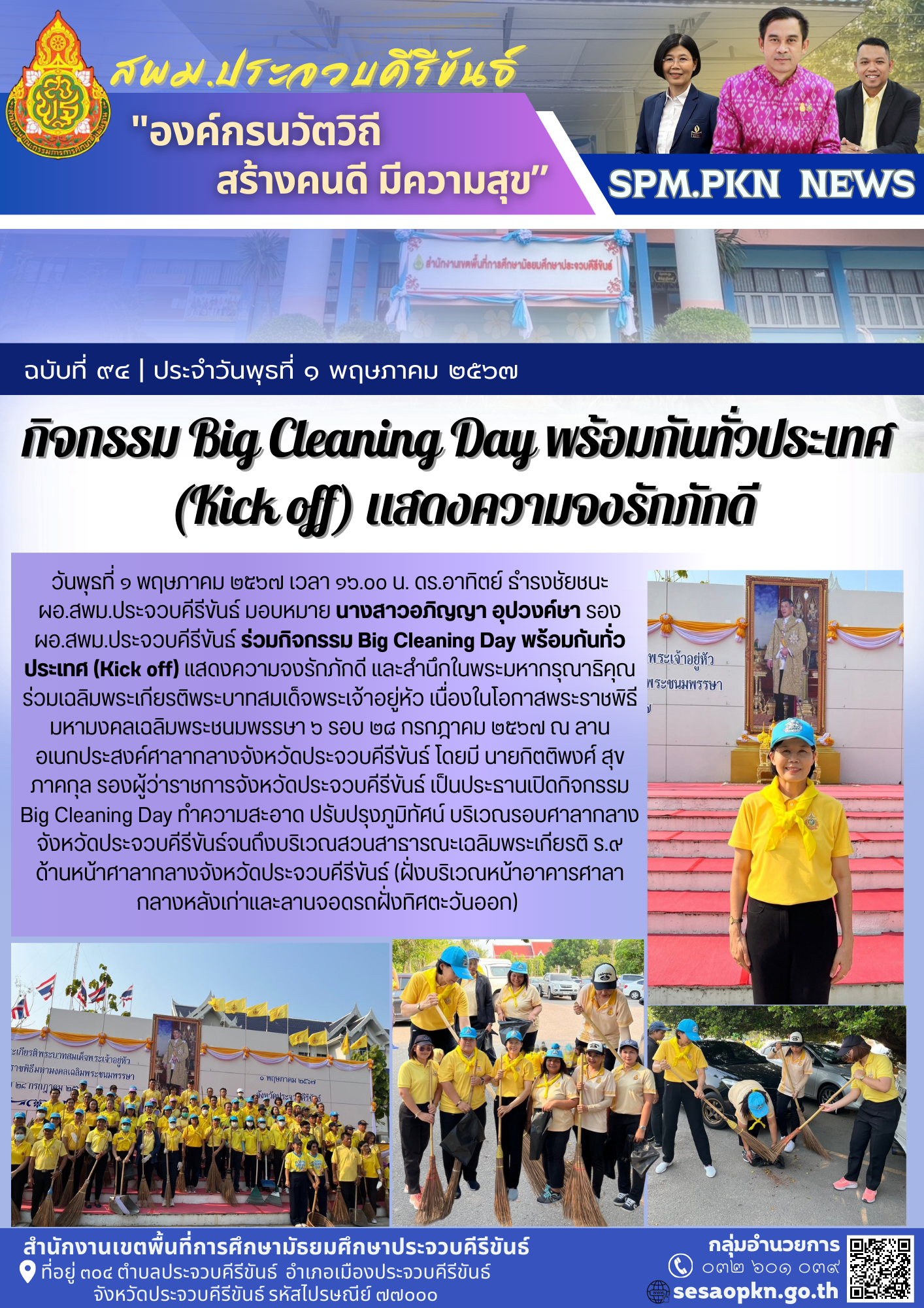 วันพุธที่ ๑ พฤษภาคม ๒๕๖๗ เวลา ๑๖.๐๐ น. ดร.อาทิตย์ ธำรงชัยชนะ ผอ.สพม.ประจวบคีรีขันธ์ มอบหมาย นางสาวอภิญญา อุปวงค์ษา รองผอ.สพม.ประจวบคีรีขันธ์  ร่วมกิจกรรม Big Cleaning Day พร้อมกันทั่วประเทศ (Kick off) แสดงความจงรักภักดี และสำนึกในพระมหากรุณาธิคุณ ร่วมเฉลิมพระเกียรติพระบาทสมเด็จพระเจ้าอยู่หัว เนื่องในโอกาสพระราชพิธีมหามงคลเฉลิมพระชนมพรรษา ๖ รอบ ๒๘ กรกฎาคม ๒๕๖๗ ณ ลานอเนกประสงค์ศาลากลางจังหวัดประจวบคีรีขันธ์ โดยมี นายกิตติพงศ์ สุขภาคกุล รองผู้ว่าราชการจังหวัดประจวบคีรีขันธ์ เป็นประธานเปิดกิจกรรม Big Cleaning Day  ทำความสะอาด ปรับปรุงภูมิทัศน์ บริเวณรอบศาลากลางจังหวัดประจวบคีรีขันธ์จนถึงบริเวณสวนสาธารณะเฉลิมพระเกียรติ ร.๙ ด้านหน้าศาลากลางจังหวัดประจวบคีรีขันธ์ (ฝั่งบริเวณหน้าอาคารศาลากลางหลังเก่าและลานจอดรถฝั่งทิศตะวันออก)