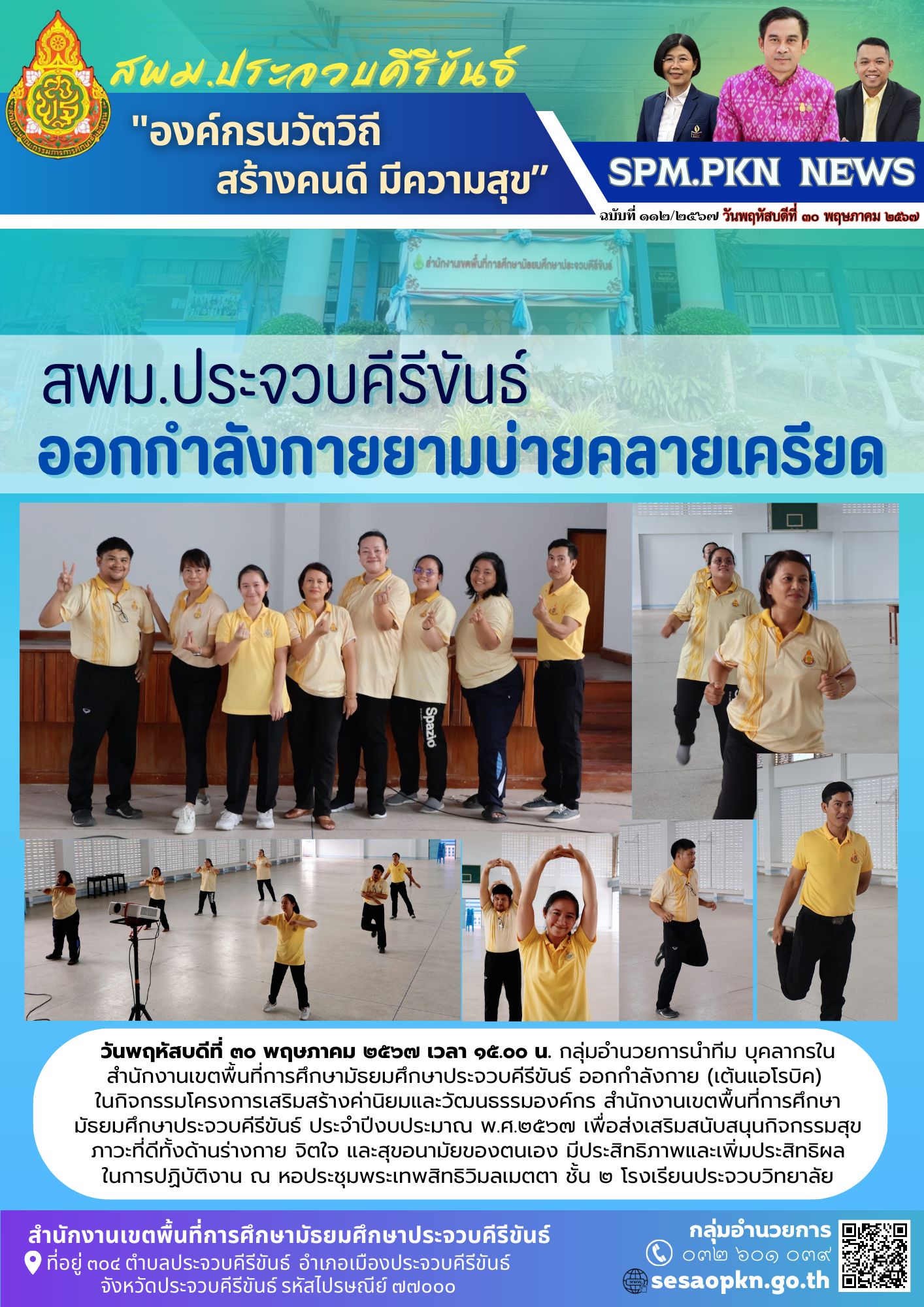 วันพฤหัสบดีที่ ๓๐ พฤษภาคม ๒๕๖๗ เวลา ๑๕.๐๐ น. กลุ่มอำนวยการนำทีม บุคลากรในสำนักงานเขตพื้นที่การศึกษามัธยมศึกษาประจวบคีรีขันธ์  ออกกำลังกาย (เต้นแอโรบิค) ในกิจกรรมโครงการเสริมสร้างค่านิยมและวัฒนธรรมองค์กร สำนักงานเขตพื้นที่การศึกษามัธยมศึกษาประจวบคีรีขันธ์ ประจำปีงบประมาณ พ.ศ.๒๕๖๗ เพื่อส่งเสริมสนับสนุนกิจกรรมสุขภาวะที่ดีทั้งด้านร่างกาย จิตใจ และสุขอนามัยของตนเอง มีประสิทธิภาพและเพิ่มประสิทธิผลในการปฏิบัติงาน  ณ หอประชุมพระเทพสิทธิวิมลเมตตา ชั้น ๒ โรงเรียนประจวบวิทยาลัย