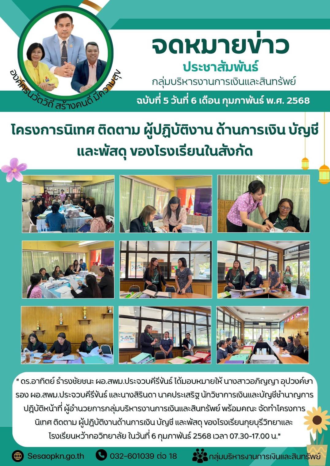 ดร.อาทิตย์ ธารงชัยชนะ ผอ.สพม.ประจวบคีรีขันธ์ได้มอบหมายให้ นางสาวอภิญญา อปวงค์ษา รอง ผอ.สพม.ประจวบคีรีขันธ์ และนางสิรินดา นาคประเสริฐ นักวิชาการเงินและบัญชีชำนาญการปฏิบัติหน้าที่ ผู้อำนวยการกลุ่มบริหารงานการเงินและสินทรัพย์ พร้อมคณะ จัดทำโครงการนิเทศ ติดตาม ผู้ปฏิบัติงานด้านการเงิน บัญชี และพัสดุ ของโรงเรียนกุยบุรีวิทยา และโรงเรียนหว้ากอวิทยาลัย ในวันที่ 6 กุมภาพันธ์ 2568 เวลา 07.30-17.00 น.