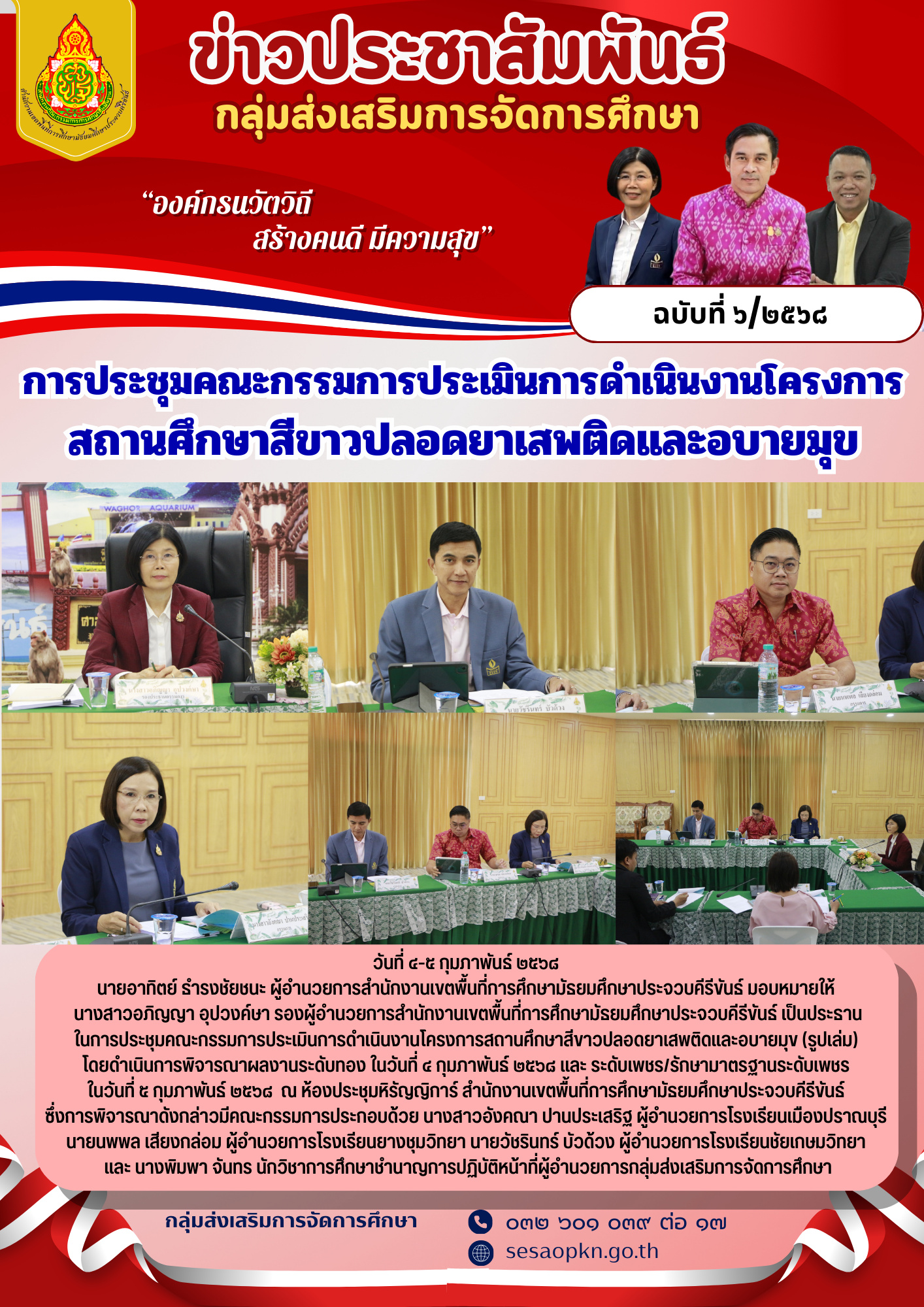 วันที่ ๔-๕ กุมภาพันธ์ ๒๕๖๘ บายอาทิตย์ ธำรงชัยชนะ ผู้อำนวยการสำนักงานเขตพื้นที่การศึกษามัธยมศึกษาประจวบคีรีขันธ์ มอบหมายให้นางสาวอภิญญา อุปวงค์ษา รองผู้อำนวยการสำนักงานเขตพื้นที่การศึกษาม้ธยมศึกษาประจวบคีรีขันธ์ เป็นประธานในการประชุมคณะกรรมการประเมินการดำเนินงานโครงการสถานศึกษาสีขาวปลอดยาเสพติดและอบายมุข (รูปเล่ม) โดยดำเนินการพิจารณาผลงานระดับทอง ในวันที่ ๔ กุมภาพันธ์ ๒๕๖๘ และ ระดับเพชรรักษาตรฐานระดับเพชร ในวันที่ ๕ กุมภาพันธ์ ๒๕๖๖๘ ณ ห้องประชบหิรัญญิการ์ สำนักงานเขตพื้นที่การศึกษาษาม้ธยมศึกษาประจวบคีรีขันธ์ ชื่อการพิจารณาดังกล่าวนี้มีคณะกรรมการประกอบด้วย นางสาวอ้งคณา ปานประเสริฐ ผู้อำนวยการโรโรงเรียบเพื่อปราณบุรี นายนพพล เสียงกล่อม ผู้อำนวยการโรงเรียนยางชุมวิทยา นายวัชรินทร์ บัวด้วง ผู้อำนวยการโรงเรียนชัยเกษมวิทยา และนางพิมพา จันทร นักวิชาการศึกษาชำนาญการปฏิบัติหน้าที่ผู้อำนวยการกลุ่มส่งเสริมการจัดการศึกษา