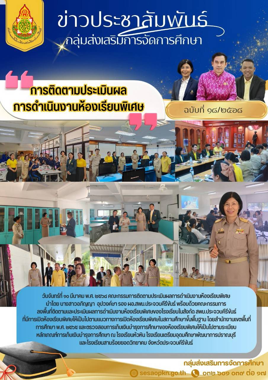 วันจันทร์ที่ ๑๐ มีนาคม พ.ศ. ๒๕๖๘ คณะกรรมการติดตามประเมินผลการดำเนินงานห้องเรียบพิเศษ นำโดย นางสาวอภิญญา อุปวงค์ษา รอง ผอ.สพม.ประจวบคีรีขันธ์ พร้อมด้วยคณะกรรมการลงพื้นที่ติดตามและประเมินผลการดำเนิบงานห้องเรียนพิเศษของโรงเรียบในสังกัด สพม.ประจวบคีรีขันธ์ที่มีการเปิดห้องเรียบพิเศษให้เป็นไปตานแนวกางการเปิดห้องเรียบพิเศษในสถานศึกษาขั้นพื้นฐาน โดยสำนักงานเขตพื้นที่การศึกษา พ.ศ. ๒๕๖๕ และตรวจลอบการเก็บเงินบำรุงการศึกษาของห้องเรียนพิเศษให้เป็นไปตามระเบียบหลักเกณฑ์การเก็บเงินบำรุงการศึกษา ณ โรงเรียนหัวหิน โรงเรียนเตรียมอุดมศึกษาพัฒนากาการปราณบุรี และโรงเรียนสามร้อยยอดวิทยาคม จังหวัดประจวบคีรีขันธ์