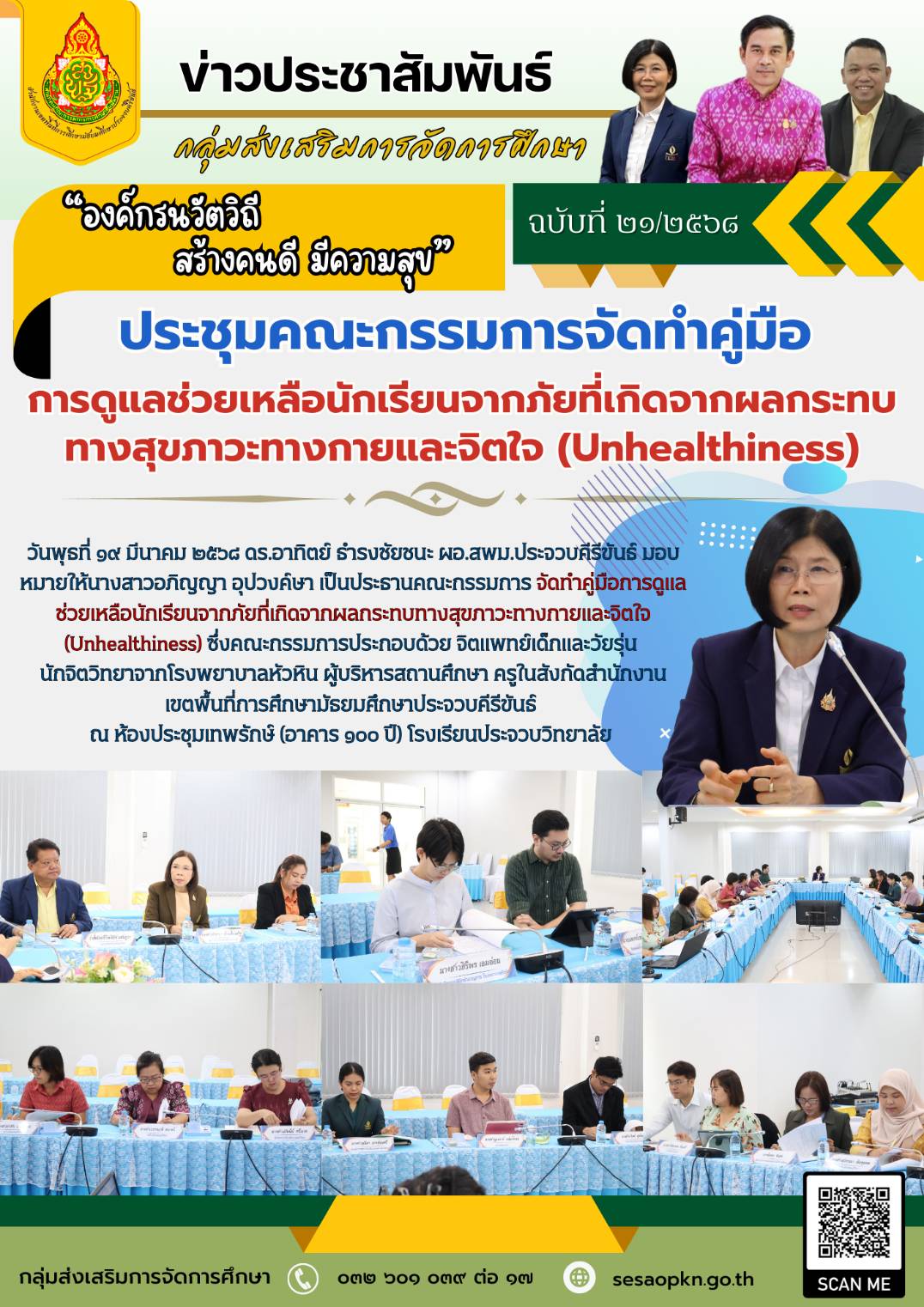 วันพุธที่ ๑๙ มีนาคม ๒๕๖๘ ดร.อาทิตย์ ธำรงชัยชนะ ผอ.สพม.ประจวบคีรีขันธ์ มอบหมายให้นางสาวอภิญญา อุปวงค์ษา เป็นประธานคณะกรรมการ จัดทำคู่มือการดูแลช่วยเหลือนักเรียนจากภัยที่เกิดจากผลกระทบทางสุขภาวะทางกายและจิตใจ(Unhealthiness) ซึ่งคณะกรรมการประกอบด้วย จิตแพทย์เด็กและวัยรุ่นนักจิตวิทยาจากโรงพยาบาลหัวหิน ผู้บริหารสถานศึกษา ครูในสังกัดสำนักงานเขตพื้นที่การศึกษามัธยมศึกษาประจวบคีรีขันธ์ ณ ห้องประชุมเทพรักษ์ (อาคาร ๑๐๐ ปี) โรงเรียนประจวบวิทยาลัย