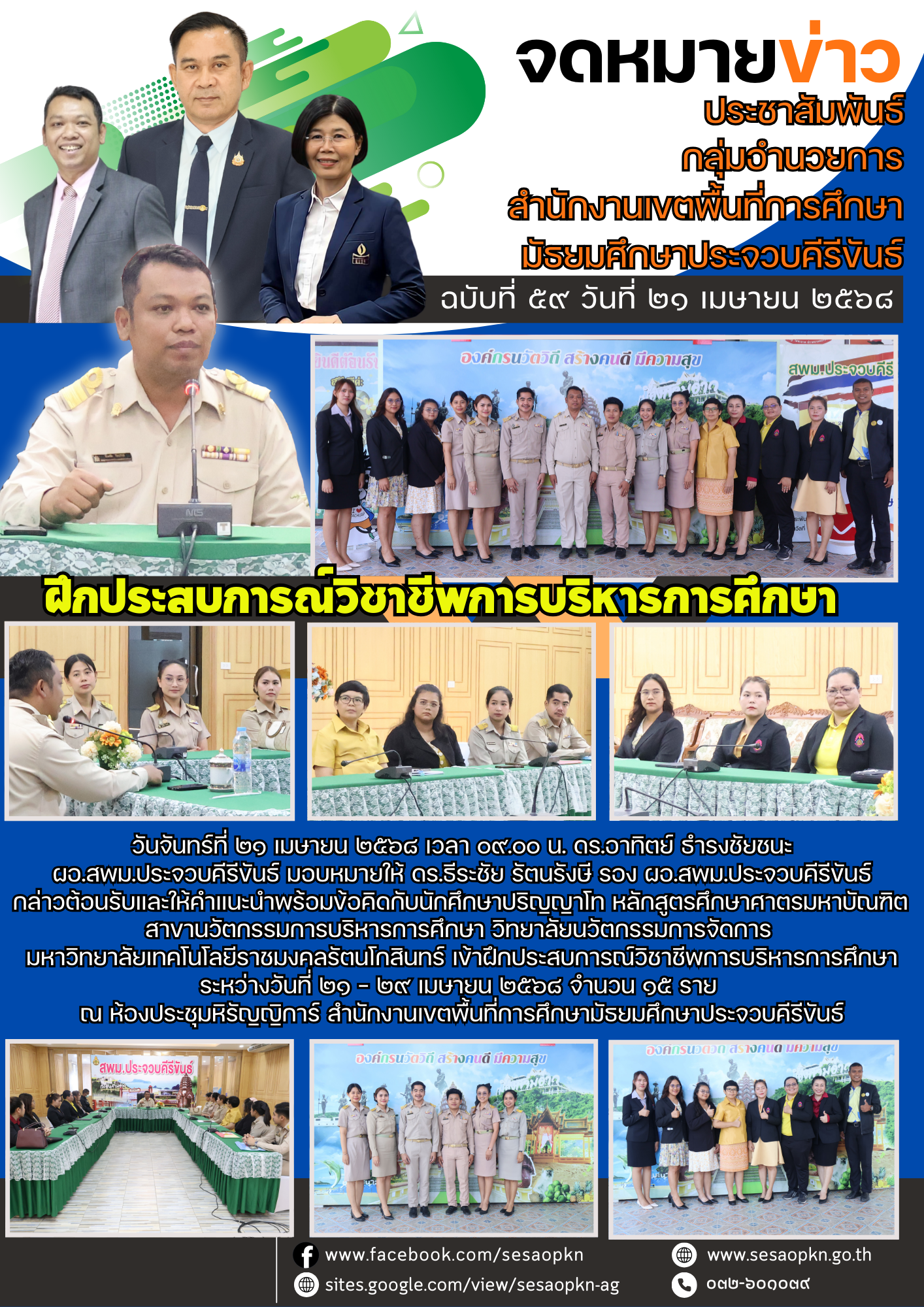 วันจันทร์ที่ ๒๑ เมษายน ๒๕๖๘ เวลา ๐๙.๐๐ น. ดร.อาทิตย์ ธำรงชัยชนะ  ผอ.สพม.ประจวบคีรีขันธ์ มอบหมายให้ ดร.ธีระชัย รัตนรังษี รอง ผอ.สพม.ประจวบคีรีขันธ์ กล่าวต้อนรับและให้คำแนะนำพร้อมข้อคิดกับนักศึกษาปริญญาโท หลักสูตรศึกษาศาตรมหาบัณฑิต สาขานวัตกรรมการบริหารการศึกษา วิทยาลัยนวัตกรรมการจัดการ มหาวิทยาลัยเทคโนโลยีราชมงคลรัตนโกสินทร์ เข้าฝึกประสบการณ์วิชาชีพการบริหารการศึกษา ระหว่างวันที่ ๒๑ - ๒๙ เมษายน ๒๕๖๘ จำนวน ๑๕ ราย ณ ห้องประชุมหิรัญญิการ์ สำนักงานเขตพื้นที่การศึกษามัธยมศึกษาประจวบคีรีขันธ์