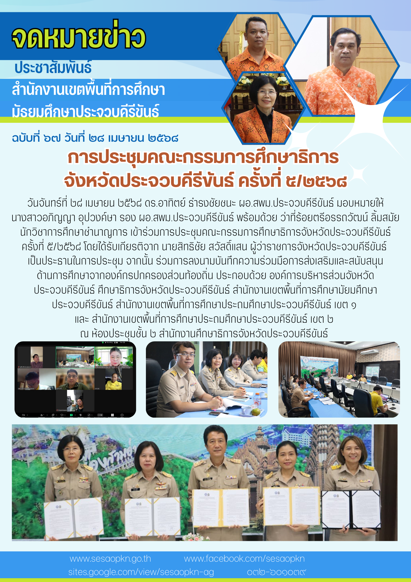วันจันทร์ที่ ๒๘ เมษายน ๒๕๖๘ ดร.อาทิตย์ ธำรงชัยชนะ ผอ.สพม.ประจวบคีรีขันธ์ มอบหมายให้ นางสาวอภิญญา อุปวงค์ษา รอง ผอ.สพม.ประจวบคีรีขันธ์ พร้อมด้วย ว่าที่ร้อยตรีอรรถวัฒน์ ลิ้มสมัย นักวิชาการศึกษาชำนาญการ เข้าร่วมการประชุมคณะกรรมการศึกษาธิการจังหวัดประจวบคีรีขันธ์ ครั้งที่ ๕/๒๕๖๘ โดยได้รับเกียรติจาก นายสิทธิชัย สวัสดิ์แสน ผู้ว่าราชการจังหวัดประจวบคีรีขันธ์ เป็นประธานในการประชุม จากนั้น ร่วมการลงนามบันทึกความร่วมมือการส่งเสริมและสนับสนุนด้านการศึกษาจากองค์กรปกครองส่วนท้องถิ่น ประกอบด้วย องค์การบริหารส่วนจังหวัดประจวบคีรีขันธ์ ศึกษาธิการจังหวัดประจวบคีรีขันธ์ สำนักงานเขตพื้นที่การศึกษามัยมศึกษาประจวบคีรีขันธ์ สำนักงานเขตพื้นที่การศึกษาประถมศึกษาประจวบคีรีขันธ์ เขต ๑ และ สำนักงานเขตพื้นที่การศึกษาประถมศึกษาประจวบคีรีขันธ์ เขต ๒ ณ ห้องประชุมชั้น ๒ สำนักงานศึกษาธิการจังหวัดประจวบคีรีขันธ์