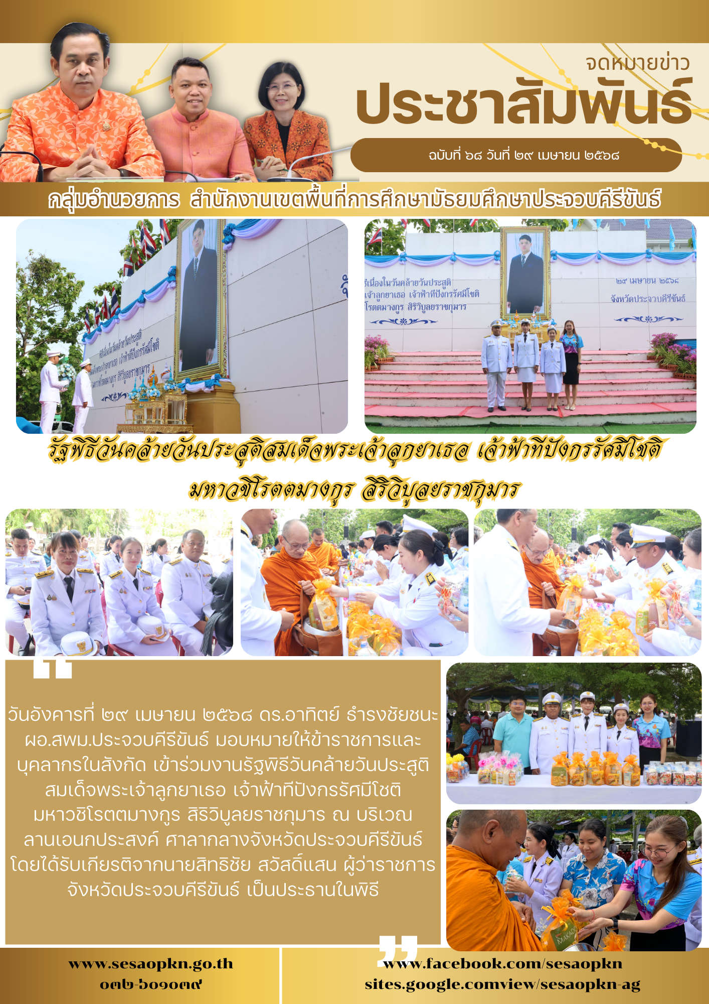 วันอังคารที่ ๒๙ เมษายน ๒๕๖๘ ดร.อาทิตย์ ธำรงชัยชนะ ผอ.สพม.ประจวบคีรีขันธ์ มอบหมายให้ข้าราชการและบุคลากรในสังกัด เข้าร่วมงานรัฐพิธีวันคล้ายวันประสูติสมเด็จพระเจ้าลูกยาเธอ เจ้าฟ้าทีปังกรรัศมีโชติ มหาวชิโรตตมางกูร สิริวิบูลยราชกุมาร ณ บริเวณลานเอนกประสงค์ ศาลากลางจังหวัดประจวบคีรีขันธ์ โดยได้รับเกียรติจากนายสิทธิชัย สวัสดิ์แสน ผู้ว่าราชการจังหวัดประจวบคีรีขันธ์ เป็นประธานในพิธี
