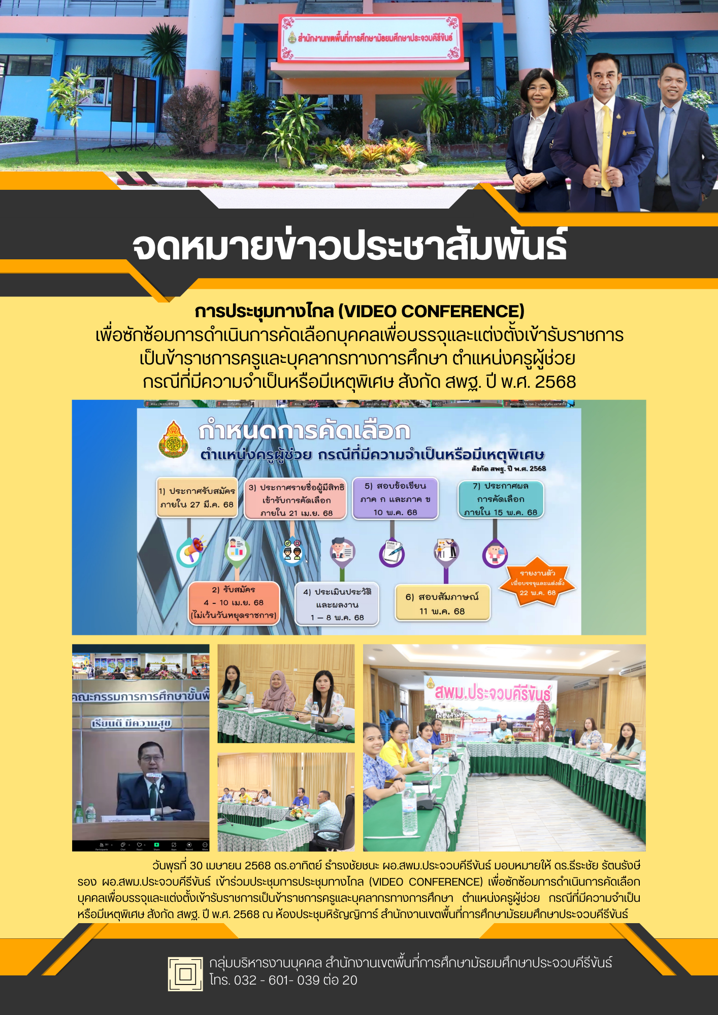 วันพุธที่ 30 เมษายน 2568 ดร.อาทิตย์ ธำรงชัยชนะ ผอ.สพม.ประจวบคีรีขันธ์ มอบหมายให้ ดร.ธีระชัย รัตนรังษี   รอง ผอ.สพม.ประจวบคีรีขันธ์ เข้าร่วมประชุมการประชุมทางไกล (VIDEO CONFERENCE) เพื่อซักซ้อมการดำเนินการคัดเลือกบุคคลเพื่อบรรจุและแต่งตั้งเข้ารับราชการเป็นข้าราชการครูและบุคลากรทางการศึกษา ตำแหน่งครูผู้ช่วย กรณีที่มีความจำเป็นหรือมีเหตุพิเศษ สังกัด สพฐ. ปี พ.ศ. 2568 ณ ห้องประชุมหิรัญญิการ์ สำนักงานเขตพื้นที่การศึกษามัธยมศึกษาประจวบคีรีขันธ์
