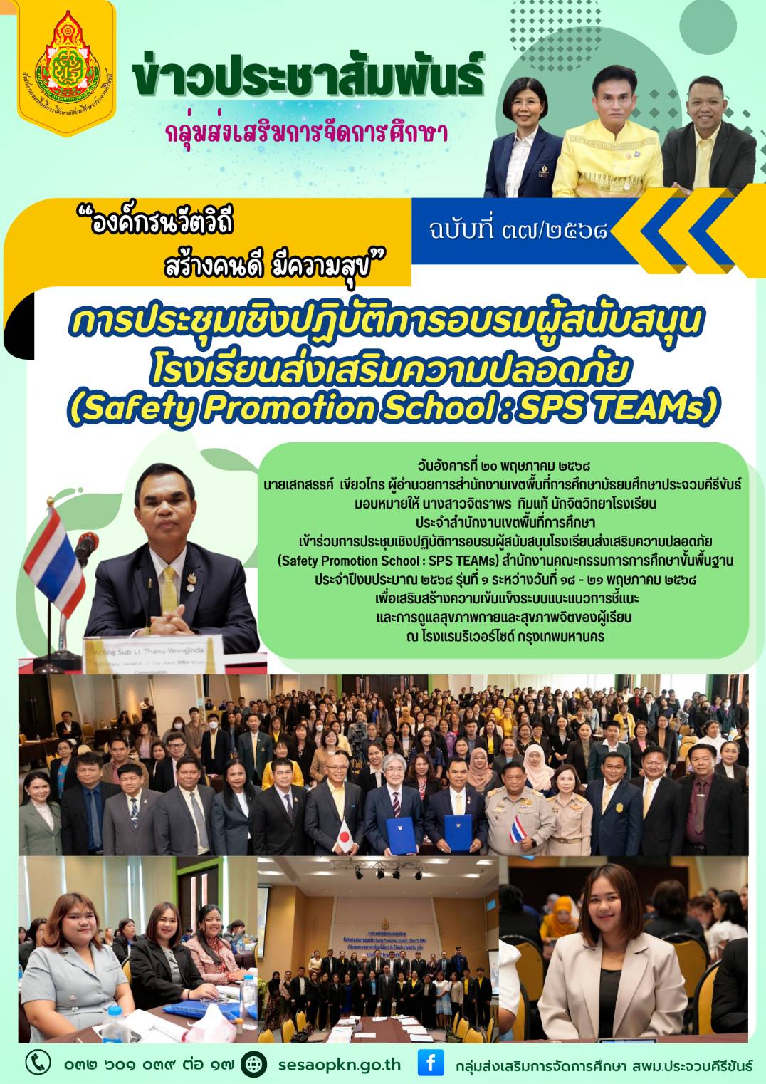 วันอังคารที่ ๒๐ พฤษภาคม ๒๕๖๘ นายเสกสรรค์ เขียวไกร ผู้อำนวยการสำนักงานเขตพื้นที่การศึกษาม้รยมศึกษาประจวบคีรีขันธ์ มอบหมายให้ นางสาวจิตราพร ทิมแท้ นักจิตวิทยาโรงเรียนประจำสำนักงานเขตพื้นที่การศึกษาเข้าร่วมการประชุมเชิงปฏิบัติการอบรมผู้สนับสนุนโรงเรียนส่งเสริมความปลอดภัย (Safety Promotion School : SPS TEAMs) สำนักงานคณะกรรบการการศึกษาขั้นพื้นฐาน ประจำเป็นประบาณ ๒๕๖๖๘ รุ่นที่ ๑ ระหว่างวันที่ ๑๘ - ๒๑ พฤษภาคม ๒๕๖๘ เพื่อเสริมสร้างความเข้มแข็งระบบแนะแนวการชี้แนะ และการดูแลสุขภาพกายและสุขภาพจิตของผู้เรียน ณ โรงแรมริเวอร์ไซด์ กรุงเทพมหานคร