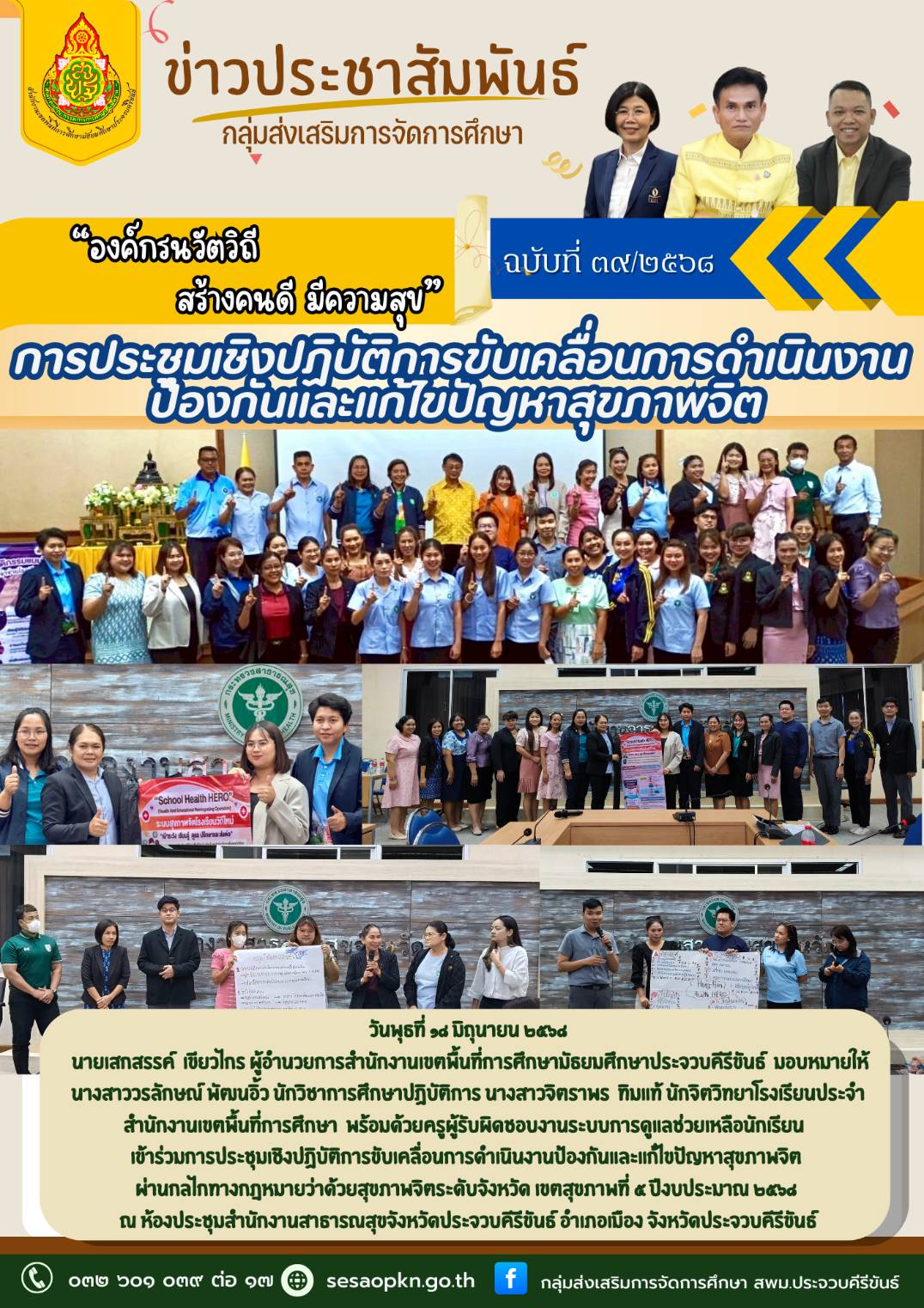 วันพุธที่ ๑๔ มิถุนายน ๒๕๖๘ นายเสทสรรค์ เขียวไกร ผู้อำนวยการสำนักงานเขตพื้นที่การศึกษามัธยมศึกษาประจวบศีรีขันธ์ มอบหมายให้ นางสาววรลักษณ์ พัฒนอิ้ว นักวิซาการศึกษาปฏิบัติการ นางสาวจิตราพร ทีมแท้ นักจิตวิทยาโรงเรียนประจำสำนักงานเขตพื้นที่การศึกษา พร้อมด้วยครูผู้รับผิดชอบงานระบบการดูแลช่วยเหลือนักเรียนเข้าร่วมการประชุมเซิงปฏิบัติการขับเคลื่อนการดำเนินงานป้องกันและแก้ไขปัญหาสุขภาพจิตผ่านกลไกทางกฎหมายว่าด้วยสุขภาพจิตระดับจังหวัด เขตสุขภาพที่ ๕ บึงบประมาณ ๒๕๖๘ ณ ห้องประชุมสำนักงานสาธารณสุขจังหวัดประจวบคีรีขันธ์ อำเภอเมือง จังหวัดประจวบคีรีขันธ์