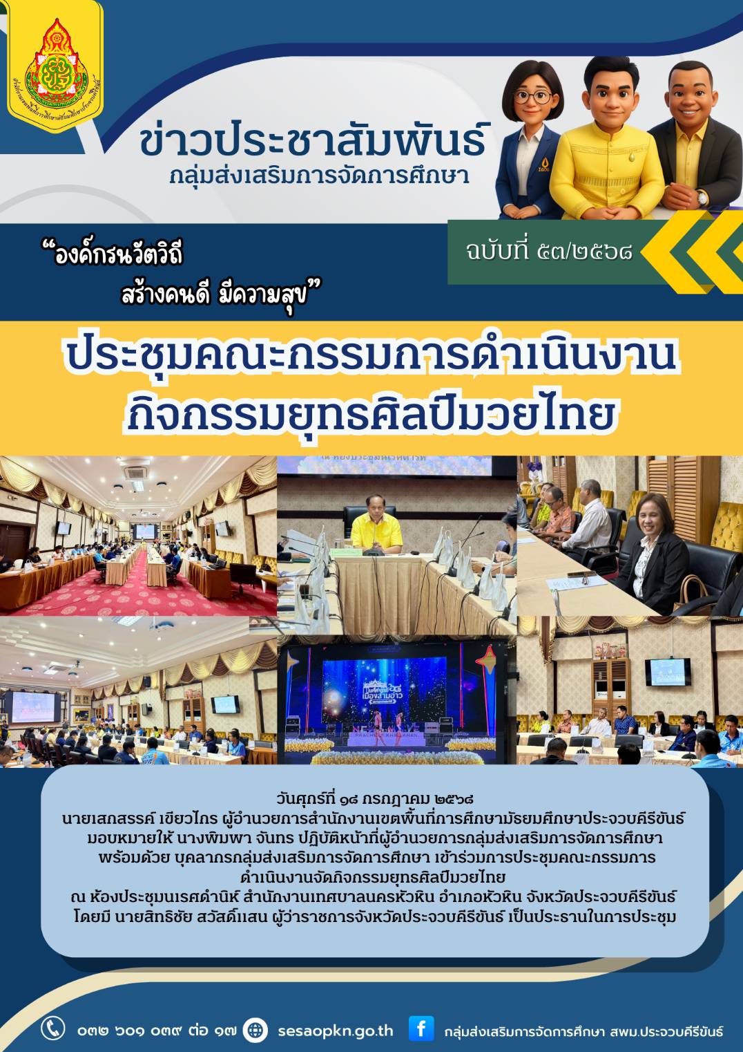 วันศุกร์ที่ ๑๘ กรกฎาคม ๒๕๖๘ นายเสกสรรค์ เขียวไกร ผู้อำนวยการสำนักงานเขตพื้นที่การศึกษามัธยมศึกษาประจวบคีรีขันธ์มอบหมายให้ นางพิมพา จันทร ปฏิบัติหน้าที่ผู้อ่านวยการกล่มส่งเสริมการจัดการศึกษาพร้อมด้วย บุคลากรกลุ่มส่งเสริมการจัดการศึกษา เข้าร่วมการประชุมคณะกรรมการดำเนินงานจัดกิจกรรมยุทธศิลปีมวยไทย ณ ห้องประชุมนเรศดำนิห์ สำนัานักงานเทศบาลนครหัวหิน อำเภอหัวหิน จังหวัดประระจวบคีรีขันธ์ โดยมี นายสิทธิชัย สวัสดิ์แสน ผู้ว่าราชการจังหวัดประจวบคีรีขันธ์ เป็นประธานในการประชุม