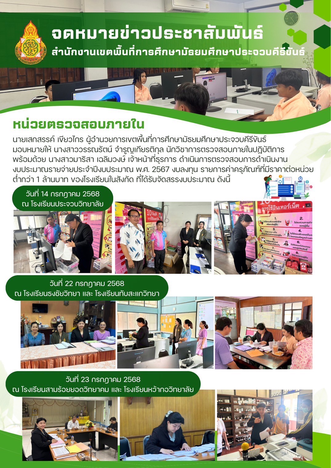 หน่วยตรวจสอบภายใน นายเสกสรรค์ เขียวไกร ผู้จำนวยการเขตพื้นที่การศึกษามัธยมศึกษาประจวบคีรีขันธ์ มอบหมายให้ นางสาววรรณรัตน์ จำรูญเกียรติกุล นักวิชาการตรวจสอบภายในปฏิบัติการ พร้อมด้วย นางสาวมาริสา เฉลิมวงษ์ เจ้าหน้าที่ธุรการ ดำเนินการตรวจสอบการดำเนินงานงบประมาณรายจ่ายประจำปีงบประมาณ พ.ศ.ศ. 2567 งบลงทุน รายการค่าครภัณฑ์ที่มีราคาต่อหน่วยต่ำกว่า 1 ล้านบาท ของโรงเรียนในสังกัด ที่ได้รับจัดสรรงบประมาณ ดังนี้