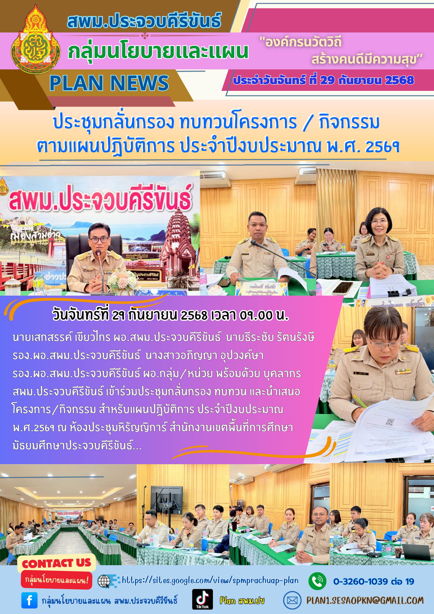 วันจันทร์ที่ 29 กันยายน 2529 เวลา 09.00 น.นายเสกสรรค์ เขียวไกร ผอ.สพม.ประจวบคีรีขันธ์  นายธีระชัย รัตนรังษี รอง.ผอ.สพม.ประจวบคีรีขันธ์  นางสาวอภิญญา อุปวงค์ษา รอง.ผอ.สพม.ประจวบคีรีขันธ์ ผอ.กลุ่ม/หน่วย พร้อมด้วย บุคลากร สพม.ประจวบคีรีขันธ์ เข้าร่วมประชุมกลั่นกรอง ทบทวน และนำเสนอโครงการ/กิจกรรม สำหรับแผนปฏิบัติการ ประจำปีงบประมาณ พ.ศ.2569 ณ ห้องประชุมหิรัญญิการ์ สำนักงานเขตพื้นที่การศึกษามัธยมศึกษาประจวบคีรีขันธ์