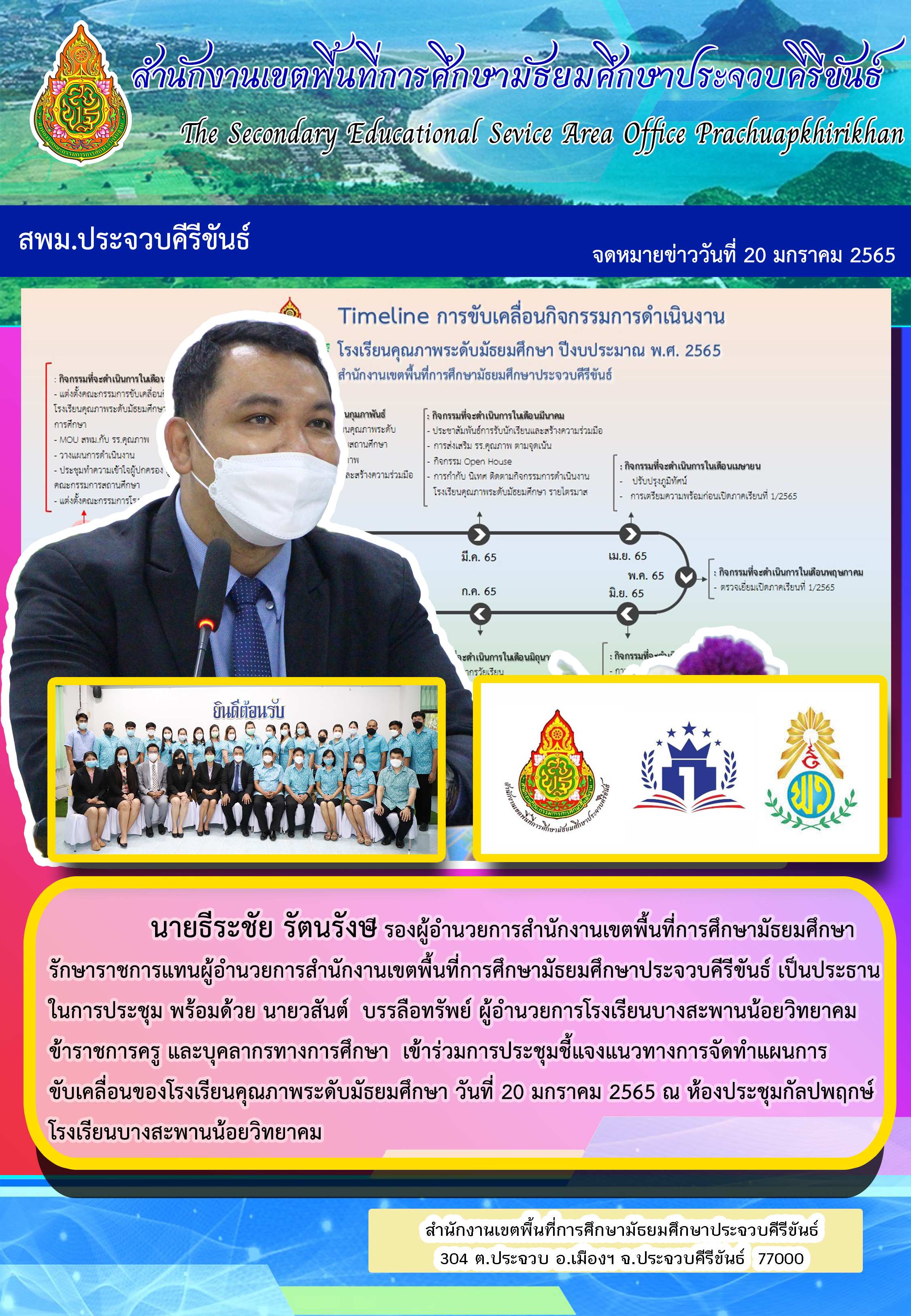 นายธีระชัย รัตนรังษี รองผู้อำนวยการสำนักงานเขตพื้นที่การศึกษามัธยมศึกษา รักษาราชการแทนผู้อำนวยการสำนักงานเขตพื้นที่การศึกษามัธยมศึกษาประจวบคีรีขันธ์ เป็นประธานในการประชุม พร้อมด้วย นายวสันต์ บรรลือทรัพย์ ผู้อำนวยการโรงเรียนบางสะพานน้อยวิทยาคม ข้าราชการครู และบุคลากรทางการศึกษา เข้าร่วมการประชุมชี้แจงแนวทางการจัดทำแผนการขับเคลื่อนของโรงเรียนคุณภาพระดับมัธยมศึกษา วันที่ 20 มกราคม 2565 ณ ห้องประชุมกัลปพฤกษ์ โรงเรียนบางสะพานน้อยวิทยาคม