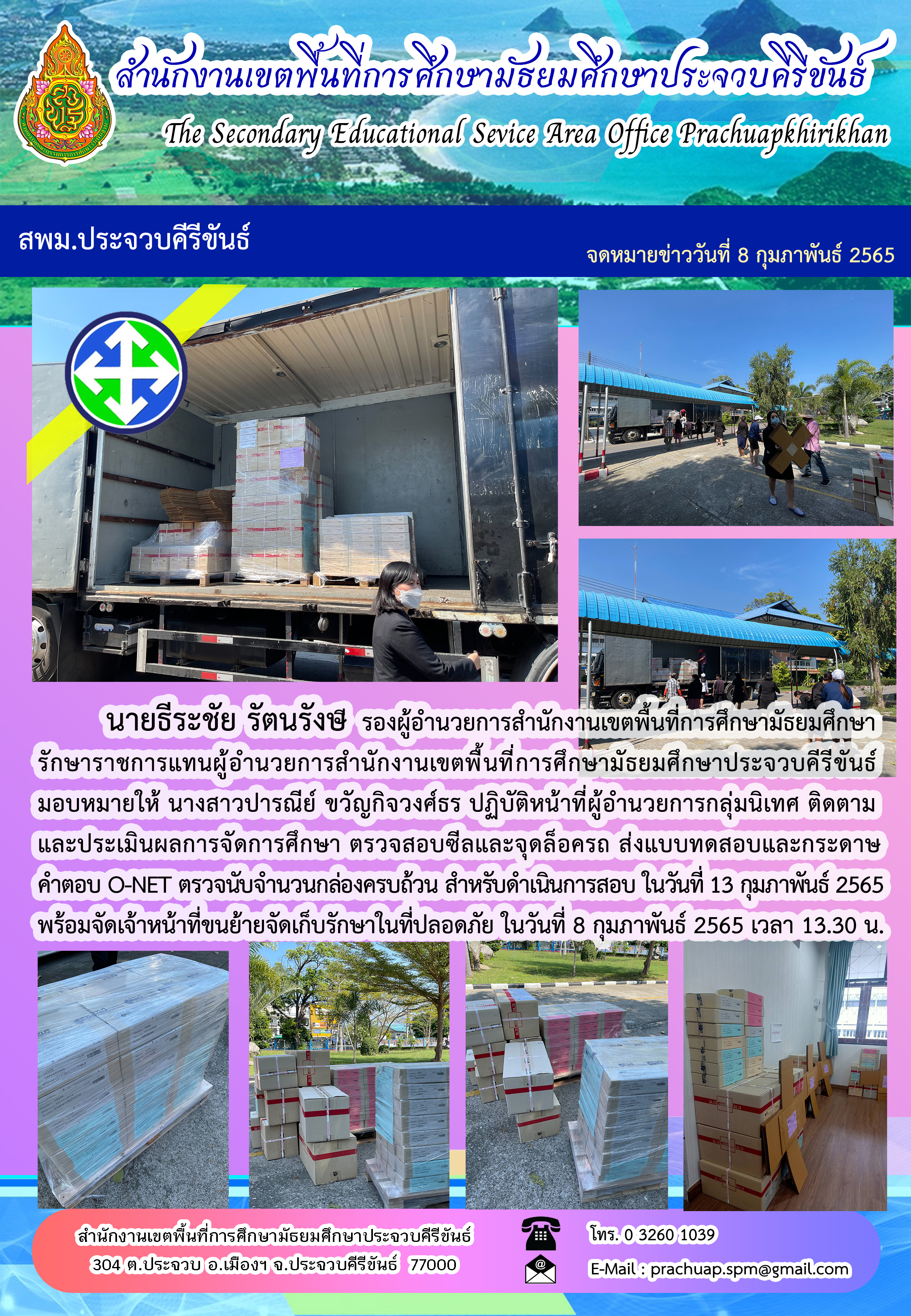 นายธีระชัย รัตนรังษี รองผู้อำนวยการสำนักงานเขตพื้นที่การศึกษามัธยมศึกษา รักษาราชการแทนผู้อำนวยการสำนักงานเขตพื้นที่การศึกษามัธยมศึกษาประจวบคีรีขันธ์ มอบหมายให้ นางสาวปารณีย์ ขวัญกิจวงศ์ธร ปฏิบัติหน้าที่ผู้อำนวยการกลุ่มนิเทศ ติดตาม และประเมินผลการจัดการศึกษา ตรวจสอบซีลและจุดล็อครถ ส่งแบบทดสอบและกระดาษคำตอบ O-NET ตรวจนับจำนวนกล่องครบถ้วน สำหรับดำเนินการสอบ ในวันที่ 13 กุมภาพันธ์ 2565 พร้อมจัดเจ้าหน้าที่ขนย้ายจัดเก็บรักษาในที่ปลอดภัย ในวันที่ 8 กุมภาพันธ์ 2565 เวลา 13.30 น.