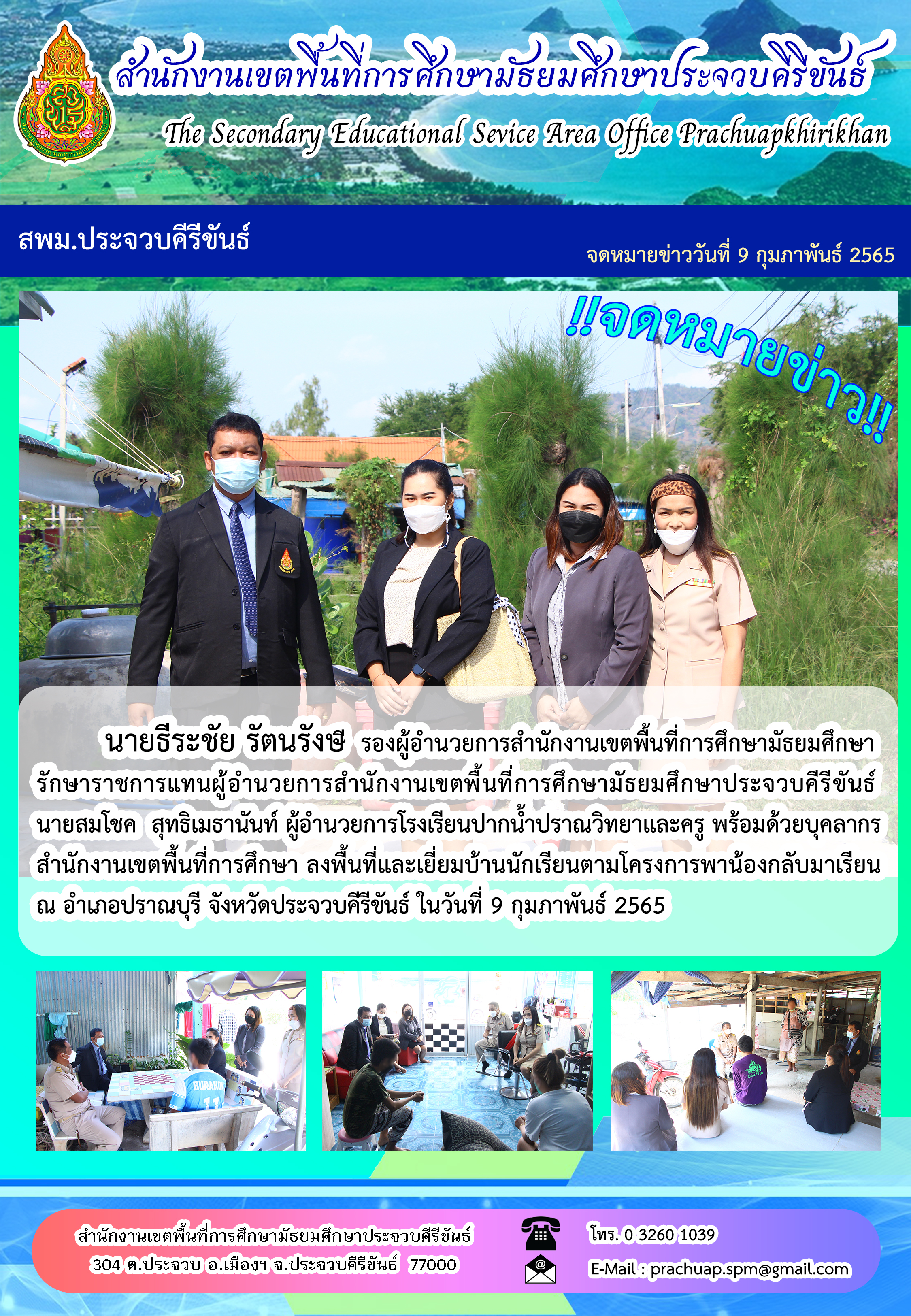 นายธีระชัย รัตนรังษ รองผู้อำนวยการสำนักงานเขตพื้นที่การศึกษามัธยมศึกษา รักษาราชการแทนผู้อำนวยการสำนักงานเขตพื้นที่การศึกษามัธยมศึกษาประจวบคีรีขันธ์ นายสมโชค สุทธิเมธานันท์ ผู้อำนวยการโรงเรียนปากน้ำปราณวิทยาและครู พร้อมด้วยบุคลากรสำนักงานเขตพื้นที่การศึกษา ลงพื้นที่และเยี่ยมบ้านนักเรียนตามโครงการพาน้องกลับมาเรียน ณ อำเภอปราณบุรี จังหวัดประจวบคีรีขันธ์ ในวันที่ 9 กุมภาพันธ์ 2565