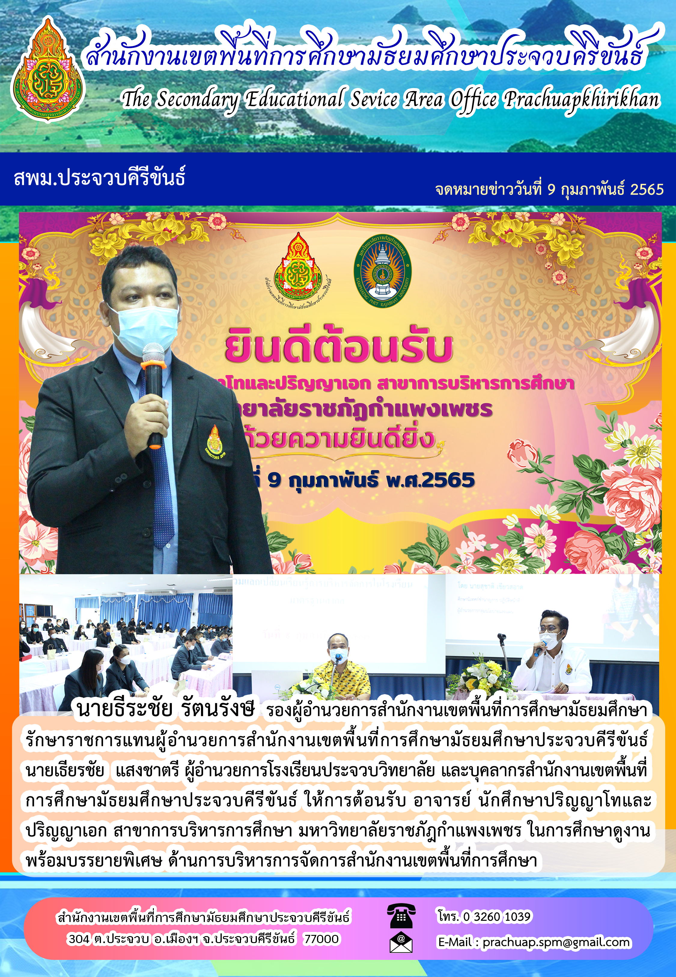 นายธีระชัย รัตนรังษี รองผู้อำนวยการสำนักงานเขตพื้นที่การศึกษามัธยมศึกษา รักษาราชการแทนผู้อำนวยการสำนักงานเขตพื้นที่การศึกษามัธยมศึกษาประจวบคีรีขันธ์ นายเธียรชัย แสงชาตรี ผู้อำนวยการโรงเรียนประจวบวิทยาลัย และบุคลากรสำนักงานเขตพื้นที่การศึกษามัธยมศึกษาประจวบคีรีขันธ์ ให้การต้อนรับ อาจารย์ นักศึกษาปริญญาโท และปริญญาเอก สาขาการบริหารการศึกษา มหาวิทยาลัยราชภัฏกำแพงเพชร ในการศึกษาดูงานพร้อมบรรยายพิเศษ ด้านการบริหารการจัดการสำนักงานเขตพื้นที่การศึกษา