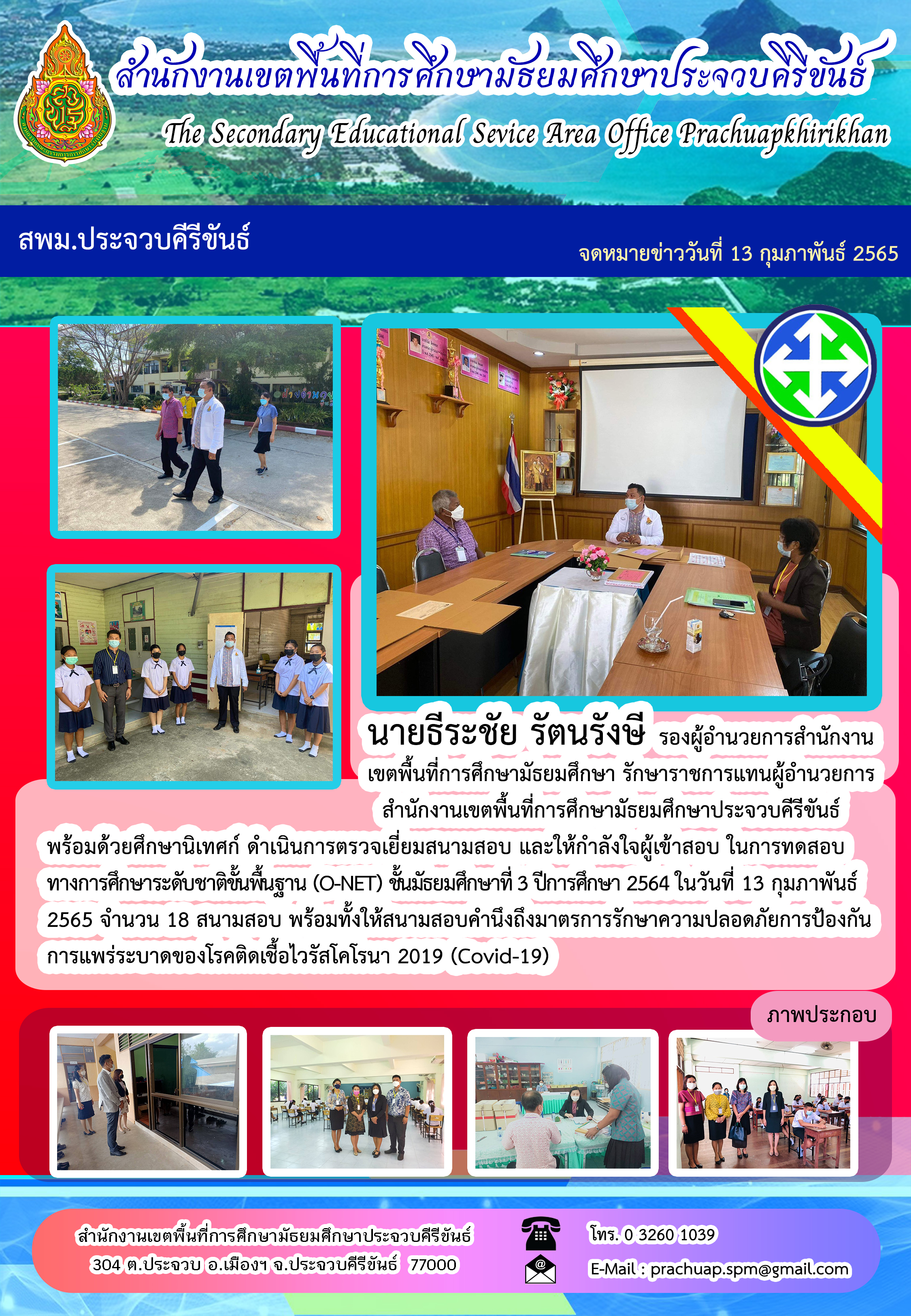 นายธีระชัย รัตนรังษี รองผู้อำนวยการสำนักงานเขตพื้นที่การศึกษามัธยมศึกษา รักษาราชการแทนผู้อำนวยการสำนักงานเขตพื้นที่การศึกษามัธยมศึกษาประจวบคีรีขันธ์ พร้อมด้วยศึกษานิเทศก์ ดำเนินการตรวจเยี่ยมสนามสอบ และให้กำลังใจผู้เข้าสอบ ในการทดสอบทางการศึกษาระดับชาติขั้นพื้นฐาน (O-NET) ชั้นมัธยมศึกษาที่ 3 ปีการศึกษา 2564 ในวันที่ 13 กุมภาพันธ์ 2565 จำนวน 18 สนามสอบ พร้อมทั้งให้สนามสอบคำนึงถึงมาตรการรักษาความปลอดภัยการป้องกันการแพร่ระบาดของโรคติดเชื้อไวรัสโคโรนา 2019 (Covid-19)