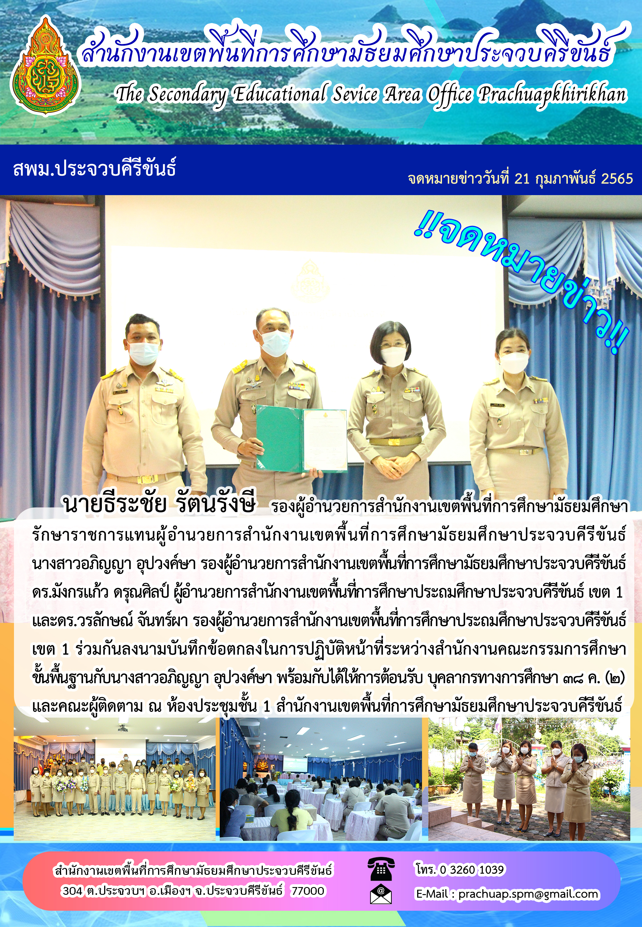 นายธีระชัย รัตนรังษี รองผู้อำนวยการสำนักงานเขตพื้นที่การศึกษามัธยมศึกษา รักษาราชการแทนผู้อำนวยการสำนักงานเขตพื้นที่การศึกษามัธยมศึกษาประจวบคีรีขันธ์ นางสาวอภิญญา อุปวงค์ษา รองผู้อำนวยการสำนักงานเขตพื้นที่การศึกษามัธยมศึกษาประจวบคีรีขันธ์ ดร.มังกรแก้ว ดรุณศิลป์ ผู้อำนวยการสำนักงานเขตพื้นที่การศึกษาประถมศึกษาประจวบคีรีขันธ์ เขต 1 และดร.วรลักษณ์ จันทร์ผา รองผู้อำนวยการสำนักงานเขตพื้นที่การศึกษาประถมศึกษาประจวบคีรีขันธ์เขต 1 ร่วมกันลงนามบันทึกข้อตกลงในการปฏิบัติหน้าที่ระหว่างสำนักงานคณะกรรมการศึกษาขั้นพื้นฐานกับนางสาวอภิญญา อุปวงศ์ษา พร้อมกับได้ให้การต้อนรับ บุคลากรทางการศึกษา ๓๘ ค. (๒) และคณะผู้ติดตาม ณ ห้องประชุมชั้น 1 สำนักงานเขตพื้นที่การศึกษามัธยมศึกษาประจวบคีรีขันธ์