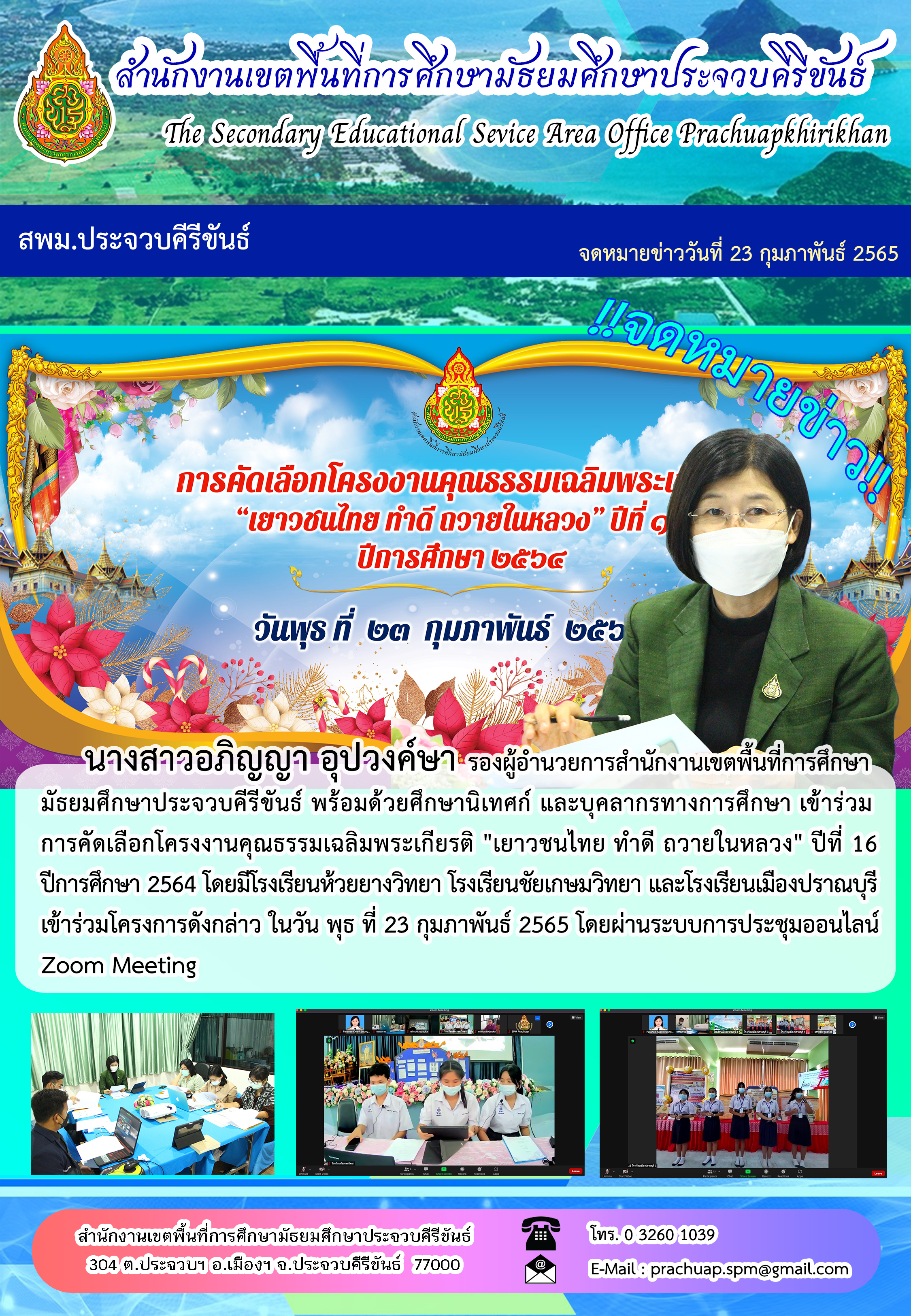 "นางสาวอภิญญา อุปวงค์ษา รองผู้อำนวยการสำนักงานเขตพื้นที่กรศึกษามัธยมศึกษาประจวบคีรีขันธ์ พร้อมด้วยศึกษานิเทศก์ และบุคลากรทางการศึกษา เข้าร่วมการคัดเลือกโครงงานคุณธรรมเฉลิมพระเกียรติ ""เยาวชนไทย ทำดี ถวายในหลวง"" ปีที่ 16 ปีการศึกษา 2564 โดยมีโรงเรียนห้วยยางวิทยา โรงเรียนชัยเกษมวิทยา และโรงเรียนเมืองปราณบุรี เข้าร่วมโครงการดังกล่าว ในวัน พุธ ที่ 23 กุมภาพันธ์ 2565 โดยผ่านระบบการประชุมออนไลน์ Zoom Meeting"