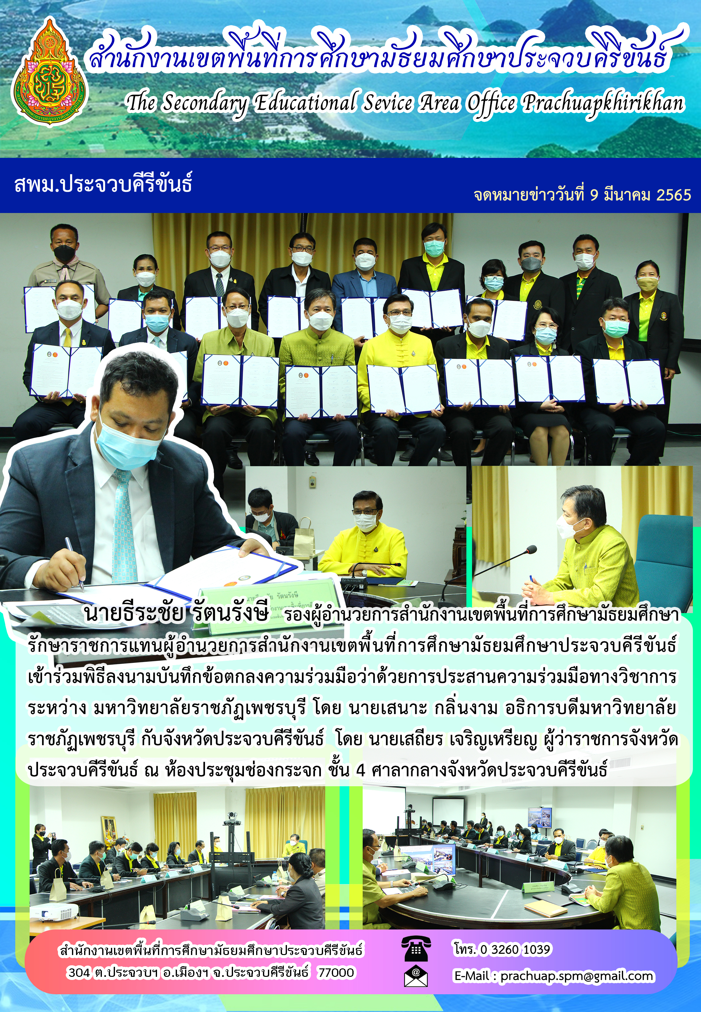 นายธีระชัย รัตนรังษี รองผู้อำนวยการสำนักงานเขตพื้นที่การศึกัษามัธยมศึกษา รักษาราชการแทนผู้อำนวยการสำนักงานเขตพื้นที่การศึกษามัธยมศึกษาประจวบคีรีขันธ์ เข้าร่วมพิธีลงนามบันทึกข้อตกลงความร่วมมือว่าด้วยการประสานความร่วมมือทางวิชาการ ระหว่าง มหาวิทยาลัยราชภัฏเพชรบุรี โดย นายเสนาะ กลิ่นงาม อธิการบดีมหาวิทยาลัยราชภัฏเพชรบุรี กับจังหวัดประจวบคีรีขันธ์ โดย นายเสถียร เจริญเหรียญ ผู้ว่าราชการจังหวัดประจวบคีรีขันธ์ ณ ห้องประชุมช่องกระจก ชั้น 4 ศาลากลางจังหวัดประจวบคีรีขันธ์