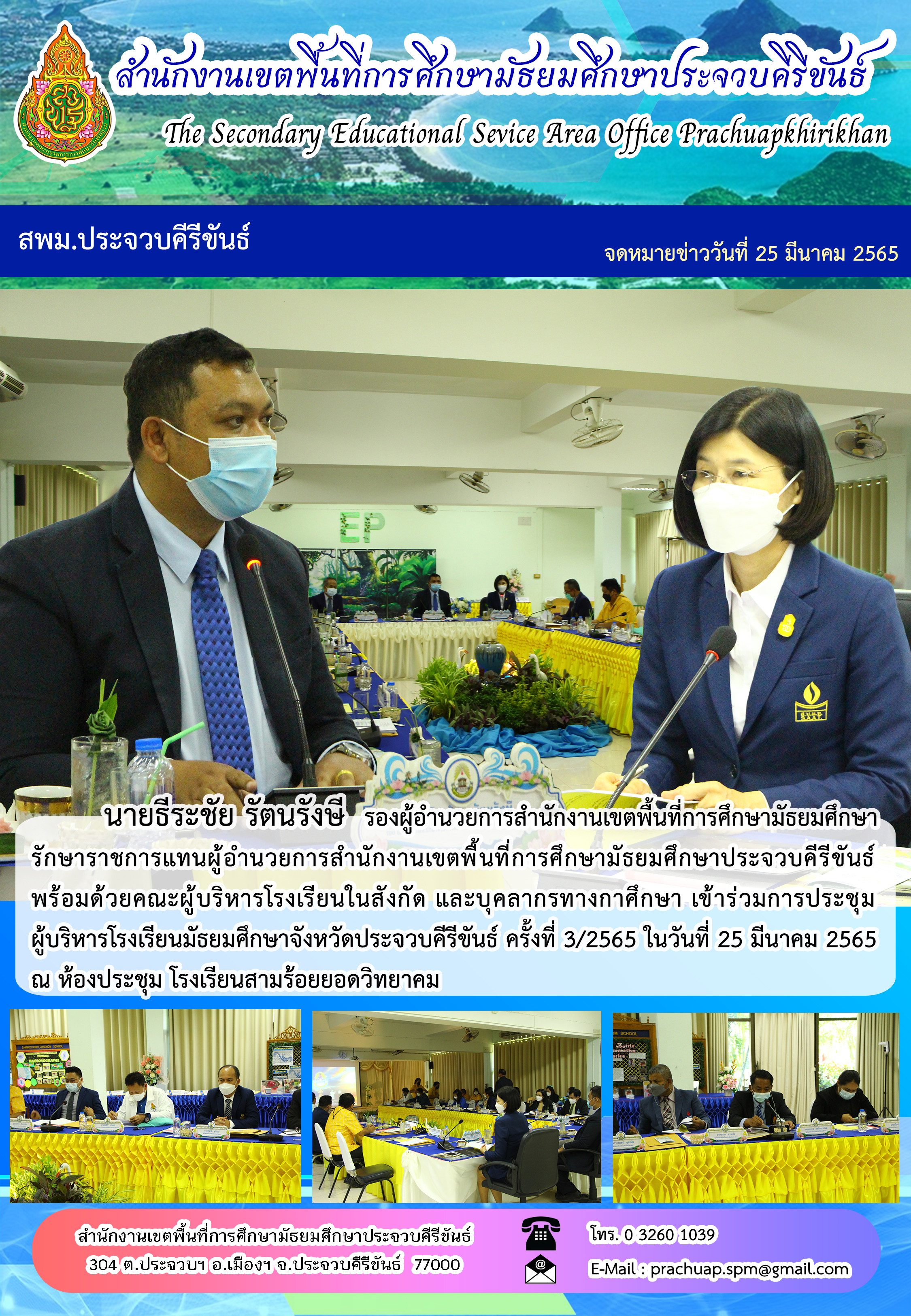 นายธีระชัย รัตนรังษี รองผู้อำนวยการสำนักงานเขตพื้นีที่กรศึกษามัธยมศึกษา รักษาราชการแทนผู้อำนวยการสำนักงานเขตพื้นที่การศึกษามัธยมศึกษาประจวบคีรีขันธ์ พร้อมด้วยคณะผู้บริหารโรงเรียนในสังกัด และบุคลากรทางกาศึกษา เข้าร่วมการประชุมผู้บริหารโรงเรียนมัธยมศึกษาจังหวัดประจวบคีรีขันธ์ ครั้งที่ 3/2565 ในวันที่ 25 มีนาคม 2565 ณ ห้องประชุม โรงเรียนสามร้อยยอดวิทยาคม