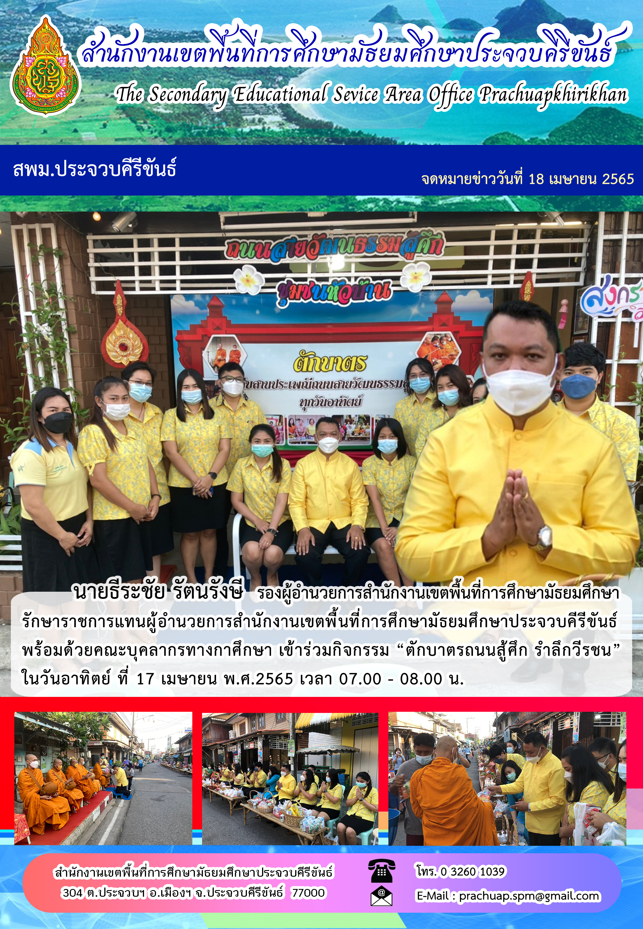 "นายธีระชัย รัตนรังษี รองผู้อำนวยการสำนักงานเขตพื้นที่การศึกษามัธยมศึกษา รักษาราชการแทนผู้อำนวยการสำนักงานเขตพื้นที่การศึกษามัธยมศึกษาประจวบคืรีขันธ์ พร้อมด้วยคณะบุคลากรทางกาศึกษา เข้าร่วมกิจกรรม ""ตักบาตรถนนสู้ศึก รำลึกวีรชน"" ในวันอาทิตย์ ที่ 17 เมษายน พ.ศ.2565 เวลา 07.00 - 08.00 น."