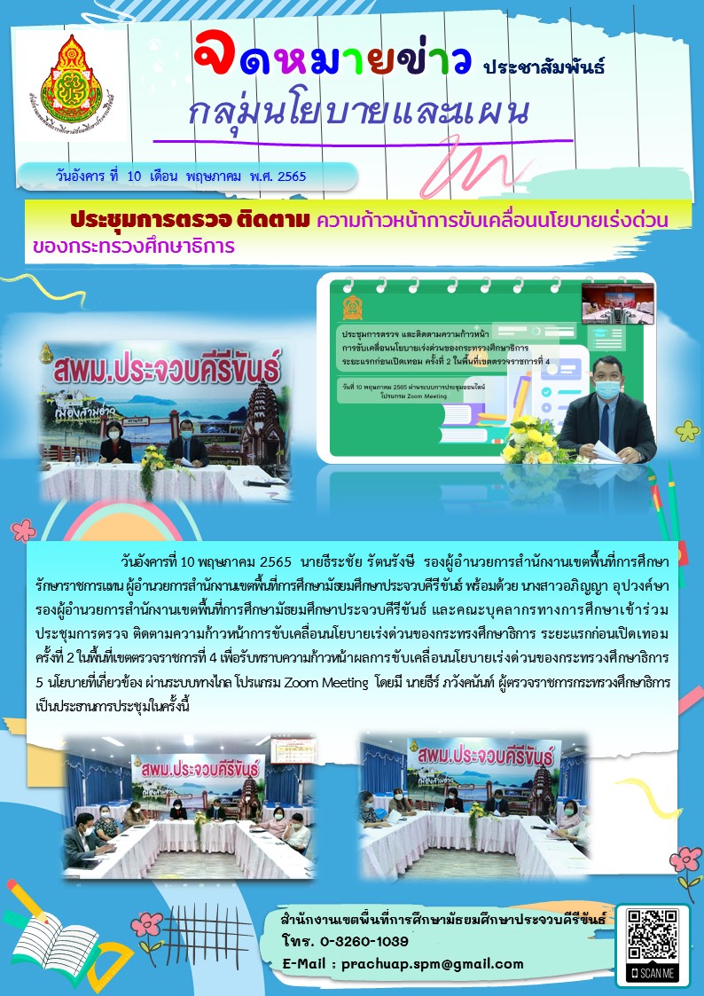 วันอังคารที่ 10 พฤษกาคม 2565 นายธีระชัย รัตนรังษี รองผู้อำนวยการสำนักงานเขตพื้นที่การศึกษา รักษาราชการแทนผู้อำนวยการสำนักงานขตพื้นที่การศึกษามัธยมศึกษาประจวบคีรีข้นธ์ พร้อมด้วย นางสาวอภิญญา อุปวงค์ษา รองผู้อำนวยการสำนักงานเขตพื้นที่การศึกษามัธยมศึกษาประจวบคีรีขันธ์ และคณะบุคลากรทางการศึกษาเข้าร่วม ประชุมการตรวจ ติดตามความก้าวหน้าการขับเคลื่อนนโยบายเร่งด่วนของกระทรงศึกษาธิการ ระยะแรกก่อนเปิดเทอมครั้งที่ 2ในพื้นที่เขตตรวจราชการที่ 4 เพื่อรับพราบความก้าวหน้าผลการขับเคลื่อนนโยบายเร่งด่วนของกระทรวงศึกษาธิการ 5 นโยบายที่เกี่ยวข้อง ผ่านระบบทางไกล โปรเกรม Zoom Meeting โดยมี นายธีร์ ภวังคนันท์ ผู้ตรวจราชการกระทรวงศึกษาธิการเป็นประธานทรประชุมในครั้งนี้
