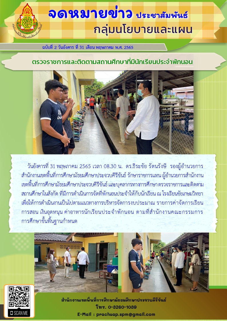 วันอังคารที่ 31 พฤษภาคม 2565 เวลา 08.30 น. ดร.ธีระชัย รัตนรังษี รองผู้อำนวยการสำนักงานเขตพื้นที่การศึกษามัธยมศึกษาประจวบคีรีขันธ์ รักษาราชการแทน ผู้อำนวยการสำนักงานเขตพื้นที่การศึกษามัธยมศึกษาประจวบคีรีขันธ์ และบุคลากรทางการศึกษา ตรวจราชการและติดตามสถานศึกษาในสังกัด ที่มีการดำเนินการจัดที่พักนอนประจำให้กับนักเรียน ณ โรงเรียนชัยเกษมวิทยาเพื่อให้การดำเนินงานเป็นไปตามแนวทางการบริหารจัดการงบประมาณ รายการค่าจัดการเรียนการสอน เงินอุดหนุน ค่าอาหารนักเรียนประจำพักนอน ตามที่สำนักงานคณะกรรมการการศึกษาขั้นพื้นฐานกำหนด