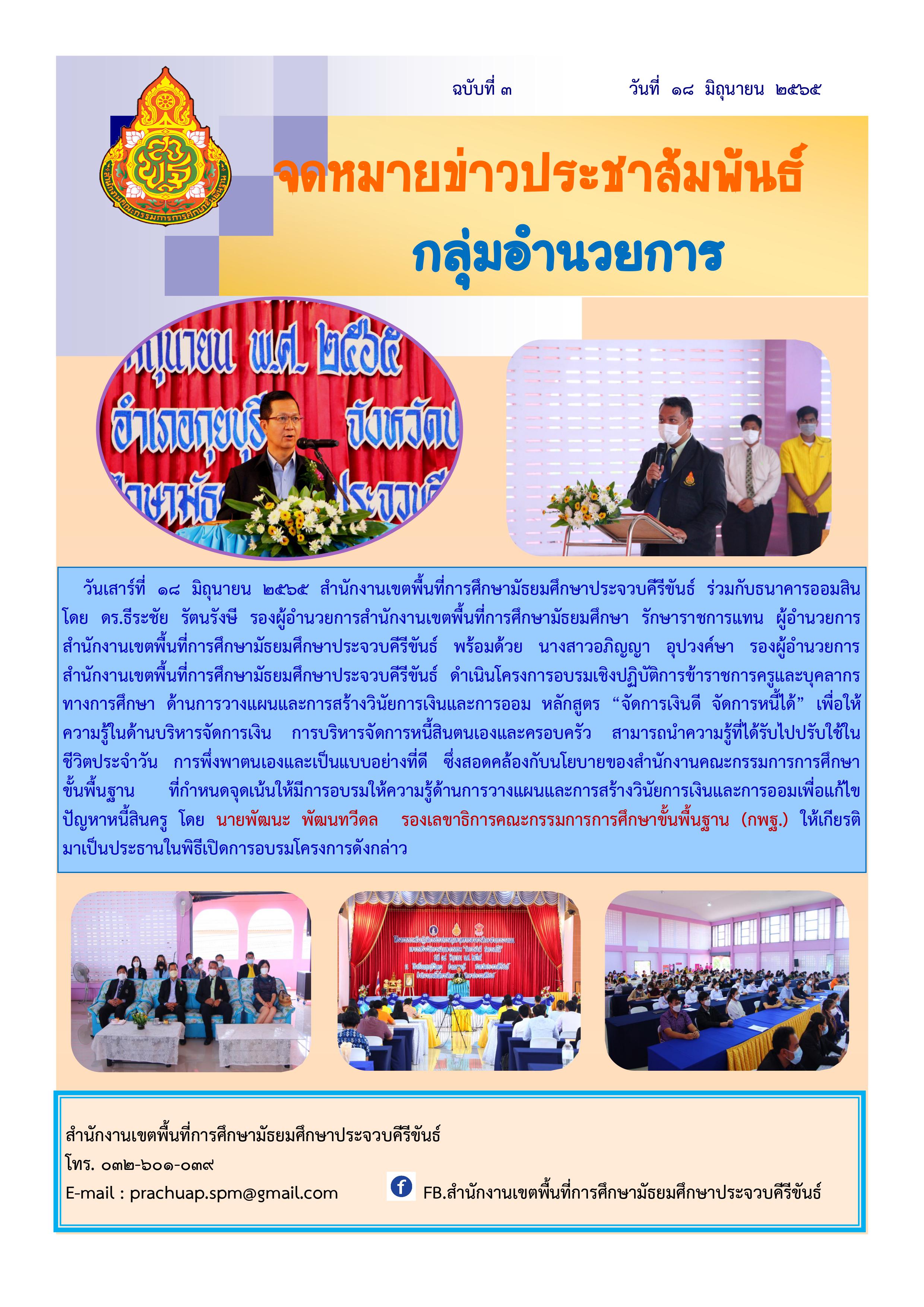 "วันเสาร์ที่ ๑๘ มิถุนายน ๒๕๖๕ สำนักงานเขตพื้นที่การศึกษามัธยมศึกษาประจวบคีรีขันธ์ ร่วมกับธนาคารออมสินโดย ดร.ธีระชัย รัตนรังษี รองผู้อำนวยการสำนักงานเขตพื้นที่การศึกษามัธยมศึกษา รักษาราชการแทน ผู้อำนวยการสำนักงานเขตพื้นที่การศึกษามัธยมศึกษาประจวบคีรีขันธ์ พร้อมด้วย นางสาวอภิญญา อุปวงศ์ษา รองผู้อำนวยการสำนักงานเขตพื้นที่การศึกษามัธยมศึกษาประจวบคีรีขันธ์ ดำเนินโครงการอบรมเชิงปฏิบัติการข้าราชการครูและบุคลากรทางการศึกษา ด้านการวางแผนและการสร้างวินัยการเงินและการออม หลักสูตร ""จัดการเงินดี จัดการหนี้ได้"" เพื่อให้ความรู้ในด้านบริหารจัดการเงิน การบริหารจัดการหนี้สินตนเองและครอบครัว สามารถนำความรู้ที่ได้รับไปปรับใช้ในชีวิตประจำวัน การพึ่งพาตนเองและเป็นแบบอย่างที่ดี ซึ่งสอดคล้องกับนโยบายของสำนักงานคณะกรรมการการศึกษาขั้นพื้นฐาน ที่กำหนดจุดเน้นให้มีการอบรมให้ความรู้ด้านการวางแผนและการสร้างวินัยการเงินและการออมเพื่อแก้ไขปัญหาหนี้สินครู โดย นายพัฒนะ พัฒนทวีดล รองเลขาธิการคณะกรรมการการศึกษาขั้นพื้นฐาน (กพฐ.) ให้เกียรติมาเป็นประธานในพิธีเปิดการอบรมโครงการดังกล่าว"