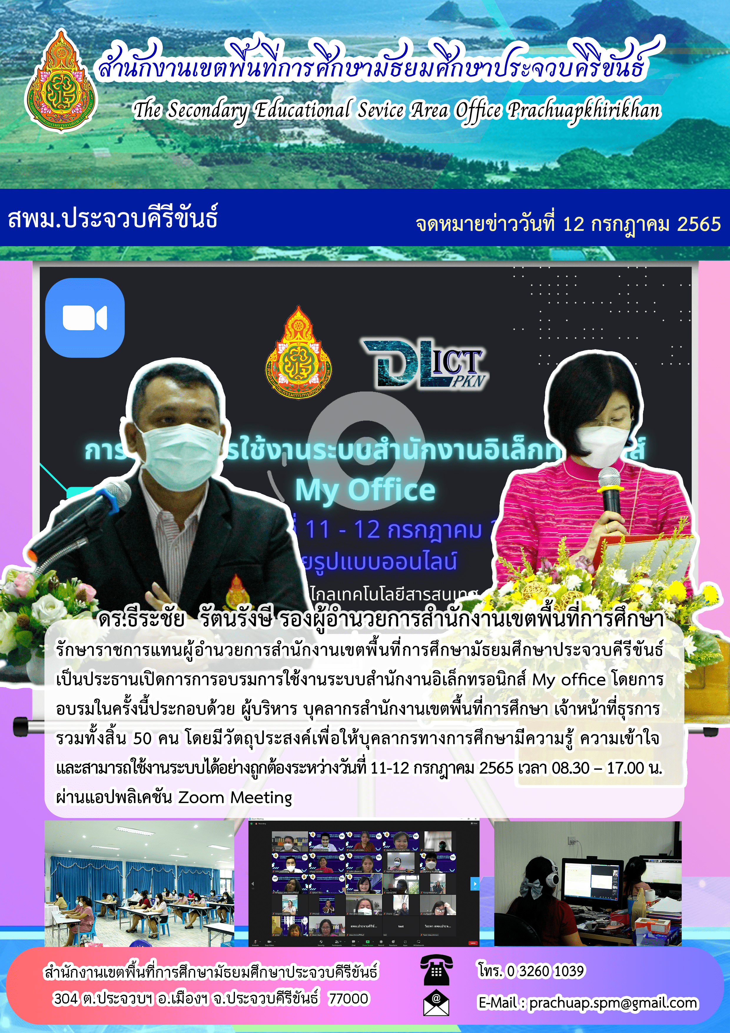 ตระธีระชัย รัตนรังษี รองผู้อำนวยการสำนักงานเขตพื้นที่การศึกษารักษาราชการแทนผู้อำนวยการสำนักงานเขตพื้นที่การศึกษามัธยมศึกษาประจวบคีรีขันธ์เป็นประธานเปิดการอบรมการใช้งานระบบสำนักงานอิเล็กทรอนิกส์ My office โดยการอบรมในครั้งนี้ประกอบด้วย ผู้บริหาร บุคลากรสำนักงานเขตพื้นที่การศึกษา เจ้าหน้าที่ธุรการ รวมทั้งสิ้น 50 คน โดยมีวัตถุประสงค์เพื่อให้บุคลากรทางการศึกษามีความรู้ ความเข้าใจและสามารถใช้งานระบบได้อย่างถูกต้องระหว่างวันที่ 11-12 กรกฎาคม 2565 เวลา 08.30 - 17.00 น. ผ่านแอปพลิเคชัน Zoom Meeting