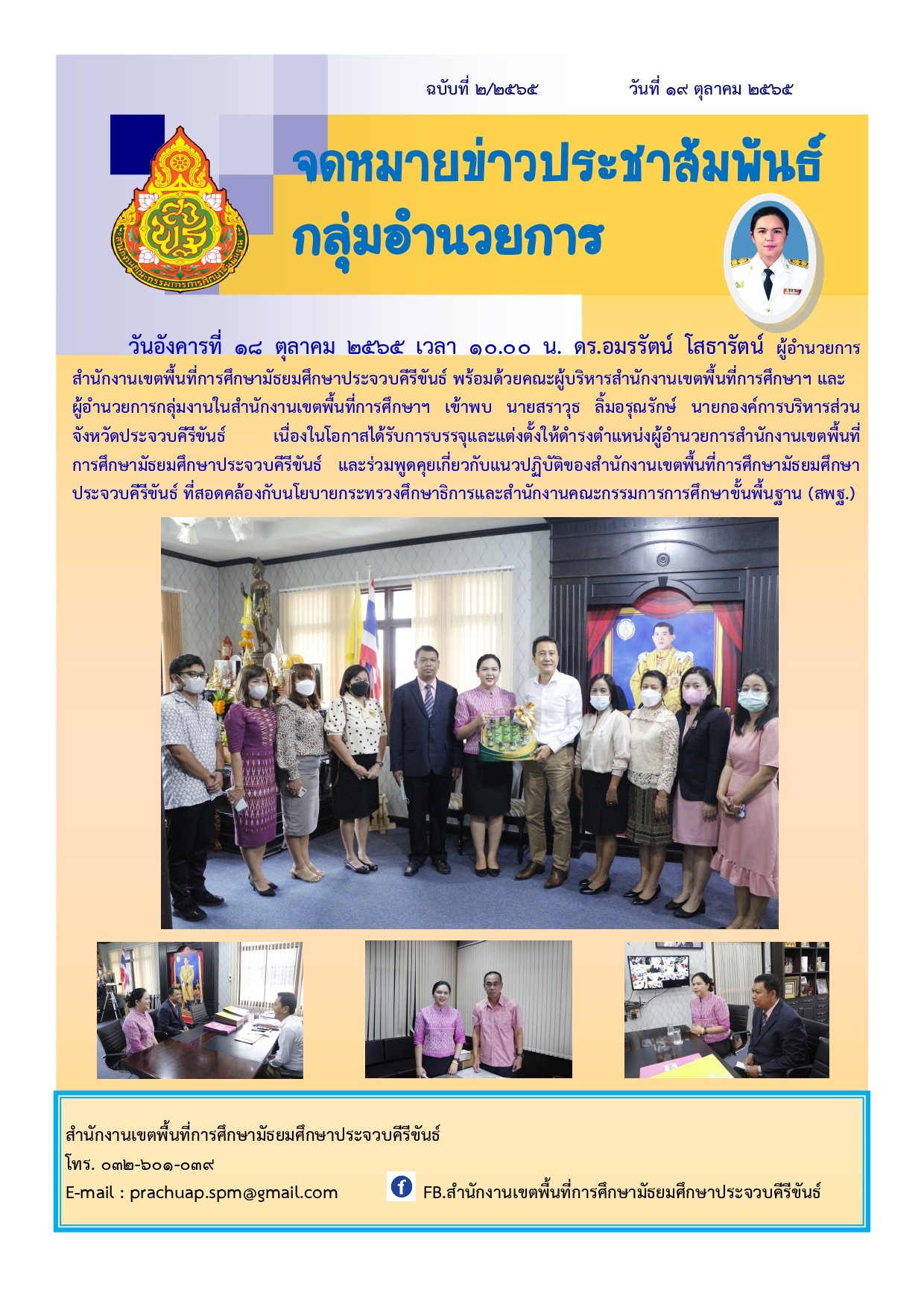 วันอังคารที่ 18 ตุลาคม 2565 เวลา 10.00 น. ดร.อมรรัตน์ โสธารัตน์ ผู้อำนวยการสำนักงานเขตพื้นที่การศึกษามัธยมศึกษาประจวบคีรีขันธ์ พร้อมด้วยคณะผู้บริหารสำนักงานเขตพื้นที่การศึกษาฯ และ ผู้อำนวยการกลุ่มงานในสำนักงานเขตพื้นที่การศึกษาฯ เข้าพบ นายสราวุธ ลิ้มอรุณรักษ์ นายกองค์การบริหารส่วน จังหวัดประจวบคีรีขันธ์ เนื่องในโอกาสได้รับการบรรจุและแต่งตั้งให้ดำรงตำแหน่งผู้อำนวยการสำนักงานเขตพื้นที่การศึกษามัธยมศึกษาประจวบคีรีขันธ์ และร่วมพูดคุยเกี่ยวกับแนวปฏิบัติของสำนักงานเขตพื้นที่การศึกษามัธยมศึกษาประจวบคืรีขันธ์ ที่สอดคล้องกับนโยบายกระทรวงศึกษาธิการและสำนักงานคณะกรรมการการศึกษาขั้นพื้นฐาน (สพฐ.)