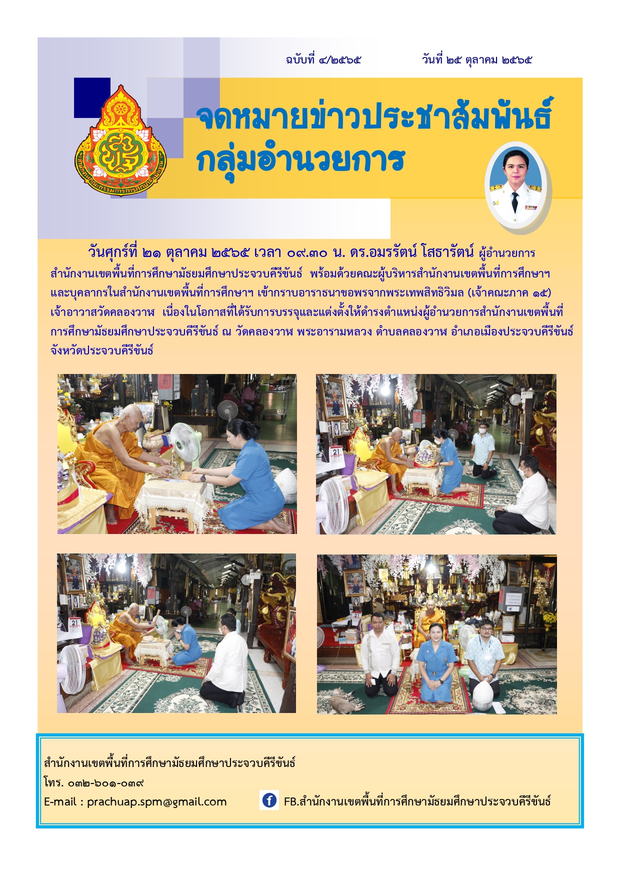 วันศุกร์ที่ 21 ตุลาคม 2565 เวลา 09.30 น. ดร.อมรรัตน์ โสธารัตน์ ผู้อำนวยการสำนักงานเขตพื้นที่การศึกษามัธยมศึกษาประจวบคีรีขันธ์ พร้อมด้วยคณะผู้บริหารสำนักงานเขตพื้นที่การศึกษาฯ และบุคลากรในสำนักงานเขตพื้นที่การศึกษาฯ เข้ากราบอาราธนาขอพรจากพระเทพสิทธิวิมล (เจ้าคณะภาค ๑๕) เจ้าอาวาสวัดคลองวาฬ เนื่องในโอกาสที่ได้รับการบรรจุและแต่งตั้งให้ดำรงตำแหน่งผู้อำนวยการสำนักงานเขตพื้นที่การศึกษามัธยมศึกษาประจวบคีรีขันธ์ ณ วัดคลองวาฬ พระอารามหลวง ตำบลคลองวาฬ อำเภอเมืองประจวบคีรีขันธ์ จังหวัดประจวบคีรีขันธ์