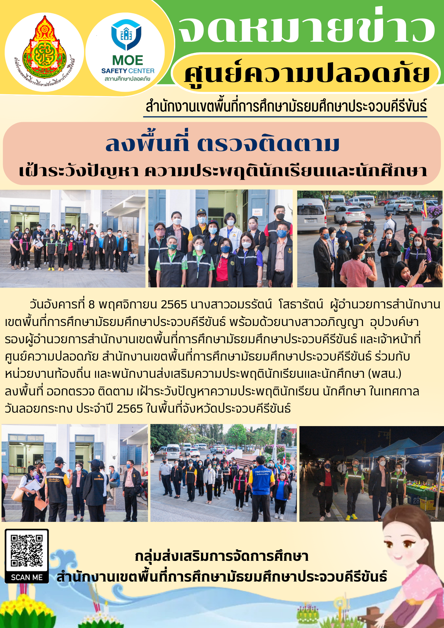 วันอังคารที่ 8 พฤศจิกายน 2565 นาปสาวอมรรัตน์ โสธารัตน์ ผู้อำนวยการสำนักงานเขตพื้นที่การศึกษามัยมศึกษาประจวบคีรีขันธ์ พร้อมด้วยนางสาวอภิญญา อุปวค์ษา รองผู้อำนวยการสำนักบานเขตพื้นที่การศึกษามัธยมศึกษาประจวบคีรีขันธ์ และเจ้าหน้าที่ศูนย์ความปลอดภัย สำนักงานเขตพื้นที่การศึกษามัธยมศึกษาประจวบคีรีขันธ์ ร่วมกับหน่วยงานท้องถิ่น และพนักงานส่งเสริมความประพฤตินักเรียนและนักศึกษา (พสน.) ลงพื้นที่ ออกตรวจ ติดตาม เฝ้าระวังปัญหาความประพฤตินักเรียน นักศึกษา ในเทศกาลวันลอยกระทง ประจำปี 2565 ในพื้นที่จังหวัดประจวบคีรีขันธ์