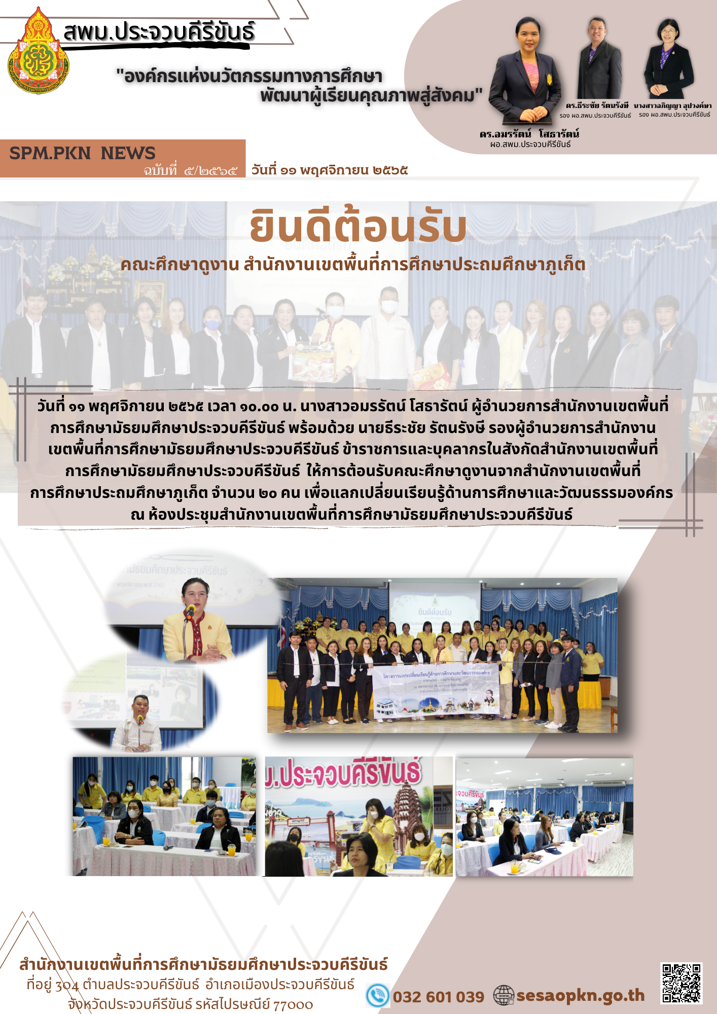 วันที่ 11 พฤศจิกายน 2565 เวลา 10.00 น. นางสาวอมรรัตน์ โสธารัตน์ ผอ.สพม.ประจวบคีรีขันธ์ พร้อมด้วย นายธีระชัย รัตนรังษี รอง ผอ.สพม.ประจวบคีรีขันธ์ ข้าราชการและบุคลากรในสังกัดสำนักงานเขตพื้นที่การศึกษามัธยมศึกษาประจวบคีรีขันธ์ ให้การต้อนรับคณะศึกษาดูงานจากสำนักงานเขตพื้นที่การศึกษาประถมศึกษาภูเก็ต จำนวน 20 คน เพื่อแลกเปลี่ยนเรียนรู้ด้านการศึกษาและวัฒนธรรมองค์กร ณ ห้องประชุมสำนักงานเขตพื้นที่การศึกษามัธยมศึกษาประจวบคีรีขันธ์