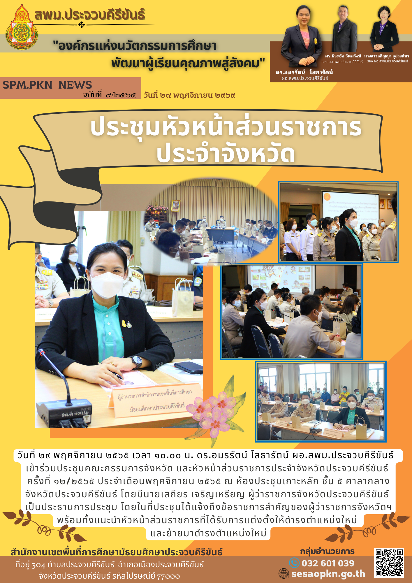 วันที่ 29 พฤศจิกายน 2565 เวลา 10.00 น. ดร.อมรรัตน์ โสธารัตน์ ผอ.สพม.ประจวบคีรีขันธ์ เข้าร่วมประชุมคณะกรรมการจังหวัด และหัวหน้าส่วนราชการประจำจังหวัดประจวบคีรีขันธ์ ครั้งที่ 12/2565 ประจำเดือนพฤศจิกายน 2565 ณ ห้องประชุมเกาะหลัก ชั้น 5 ศาลากลาง จังหวัดประจวบคีรีขันธ์ โดยมีนายเสถียร เจริญเหรียญ ผู้ว่าราชการจังหวัดประจวบคีรีขันธ์ เป็นประธานการประชุม โดยในที่ประชุมได้แจ้งถึงข้อราชการสำคัญของผู้ว่าราชการจังหวัดฯ พร้อมทั้งแนะนำหัวหน้าส่วนราชการที่ได้รับการแต่งตั้งให้ดำรงตำแหน่งใหม่ และย้ายมาดำรงตำแหน่งใหม่