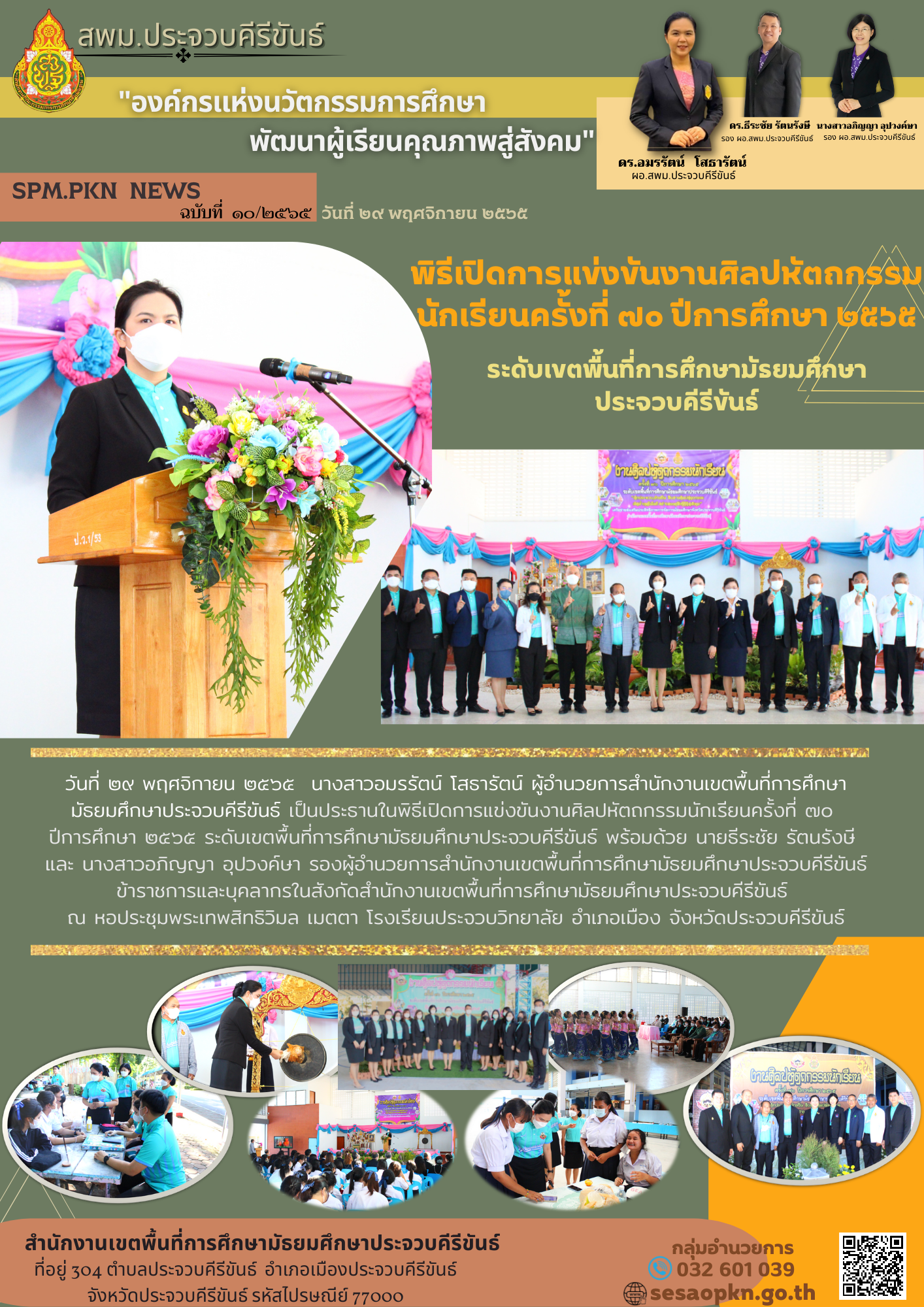 วันที่ 29 พฤศจิกายน 2565 นางสาวอมรรัตน์ โสธารัตน์ ผู้อำนวยการสำนักงานเขตพื้นที่การศึกษามัธยมศึกษาประจวบคีรีขันธ์ เป็นประธานในพิธีเปิดการแข่งขันงานศิลปหัตถกรรมนักเรียนครั้งที่ 70 ปีการศึกษา 2565 ระดับเขตพื้นที่การศึกษามัธยมศึกษาประจวบคีรีขันธ์ พร้อมด้วย นายธีระชัย รัตนรังษี และ นางสาวอภิญญา อุปวงค์ษา รองผู้อำนวยการสำนักงานเขตพื้นที่การศึกษามัธยมศึกษาประจวบคีรีขันธ์ ข้าราชการและบุคลากรในสังกัดสำนักงานเขตพื้นที่การศึกษามัธยมศึกษาประจวบคีรีขันธ์ณ หอประชุมพระเทพสิทธิวิมล เมตตา โรงเรียนประจวบวิทยาลัย อำเภอเมือง จังหวัดประจวบคีรีขันธ์