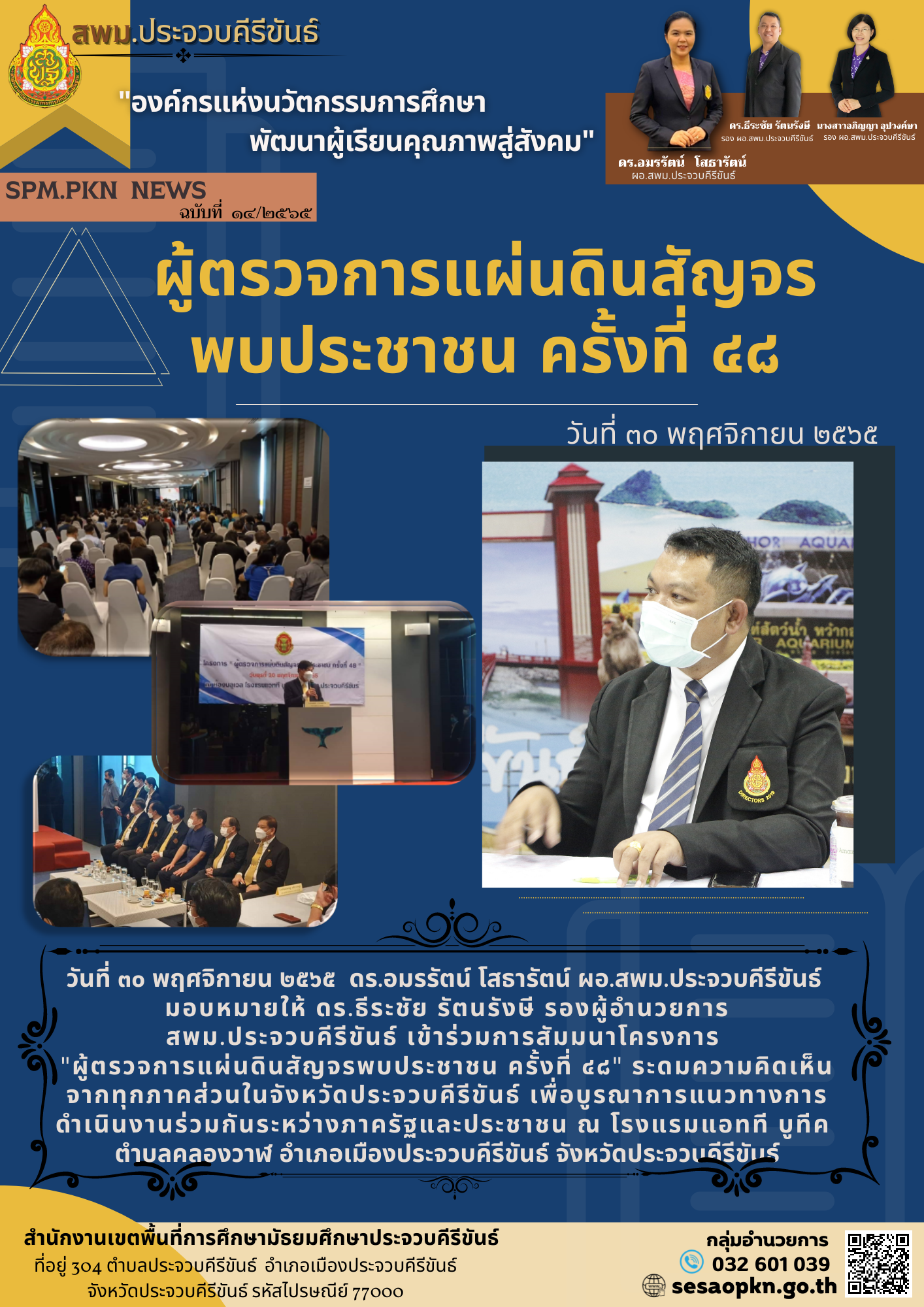"วันที่ 30 พฤศจิกายน 2565 ดร.อมรรัตน์ โสธารัตน์ ผอ.สพม.ประจวบคีรีขันธ์ มอบหมายให้ ดร.ธีระชัย รัตนรังษี รองผู้อำนวยการ สพม.ประจวบคีรีขันธ์ เข้าร่วมการสัมมนาโครงการ ""ผู้ตรวจการแผ่นดินสัญจรพบประชาชน ครั้งที่ ๔๘"" ระดมความคิดเห็น จากทุกภาคส่วนในจังหวัดประจวบคีรีขันธ์ เพื่อบูรณาการแนวทางการ ดำเนินงานร่วมกันระหว่างภาครัฐและประชาชน ณ โรงแรมแอทที บูทีค ตำบลคลองวาฬ อำเภอเมืองประจวบคีรีขันธ์ จังหวัดประจวนดีรีขันธ์"
