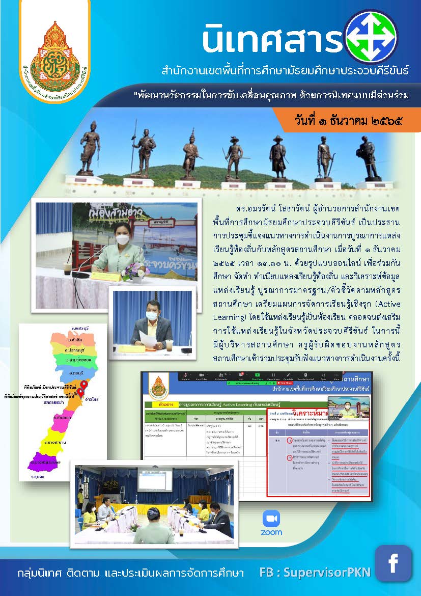 ดร.อมรรัตน์ โสธารัตน์ ผู้อำนวยการสำนักงานเขตพื้นที่การศึกษามัธยมศึกษาประจวบคีรีขันธ์ เป็นประธานการประชุมชี้แจงแนวทางการดำเนินงานการบูรณาการแหล่งเรียนรู้ท้องถิ่นกับหลักสูตรสถานศึกษา เมื่อวันที่ 1 ธันวาคม 2565 เวลา 13.30 น. ด้วยรูปแบบออนไลน์ เพื่อร่วมกันศึกษา จัดทำ ทำเนียบแหล่งเรียนรู้ท้องถิ่น และวิเคราะห์ ข้อมูลแหล่งเรียนรู้ บูรณาการมาตรฐาน/ตัวชี้วัดตามหลักสูตรสถานศึกษา เตรียมแผนการจัดการเรียนรู้เชิงรุก (Active Learninเ) โดยใช้แหล่งเรียนรู้เป็นห้องเรียน ตลอดจนส่งเสริมการใช้แหล่งเรียนรู้ในจังหวัดประจวบคีรีขันธ์ ในการนี้มีผู้บริหารสถานศึกษา ครูผู้รับผิดชอบงานหลักสูตรสถานศึกษาเข้าร่วมประชุมรับฟังแนวทางการดำเนินงานครั้งนี้